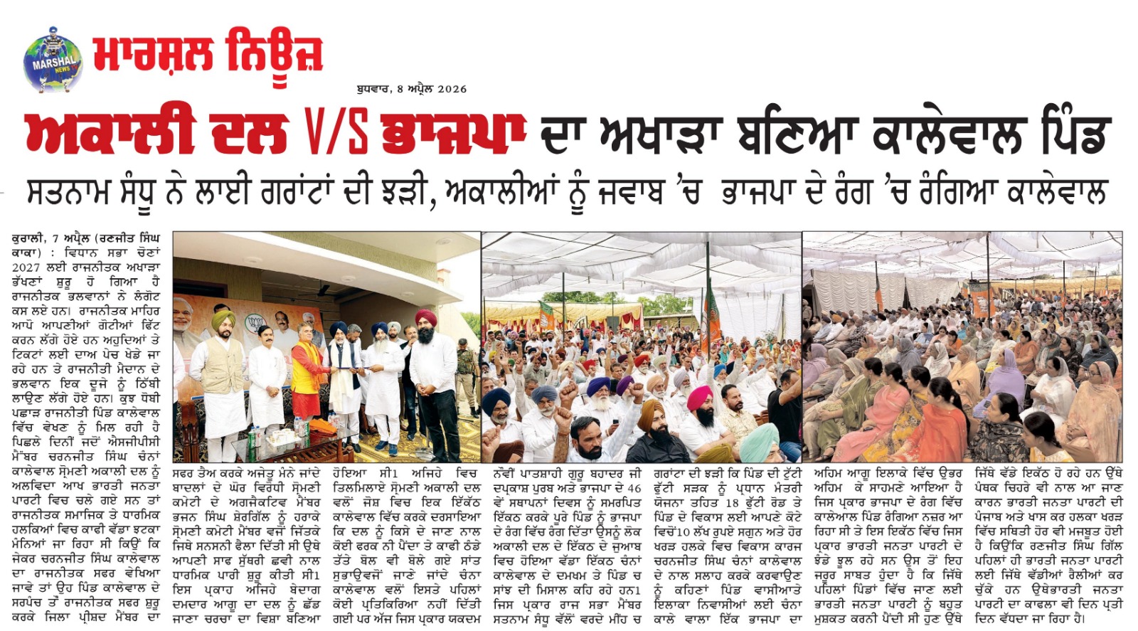 ਸਤਨਾਮ ਸੰਧੂ ਨੇ ਲਾਈ ਗਰਾਂਟਾਂ ਦੀ ਝੜੀ ਅਕਾਲੀਆਂ ਨੂੰ ਜਵਾਬ ਚ ਭਾਜਪਾ ਦੇ ਰੰਗ ਚ ਰੰਗਿਆ ਕਾਲੇਵਾਲ ਕੁਰਾਲੀ 7 ਅਪ੍ਰੈਲ( ਰਣਜੀਤ ਸਿੰਘ ਕਾਕਾ) ਵਿਧਾਨ ਸਭਾ ਚੋਣਾਂ 2027 ਲਈ ਰਾਜਨੀਤਕ ਅਖਾੜਾ ਭੱਖਣਾਂ ਸ਼ੁਰੂ ਹੋ ਗਿਆ ਹੈ ਰਾਜਨੀਤਕ ਭਲਵਾਨਾਂ ਨੇ ਲੰਗੋਟ ਕਸ ਲਏ ਹਨ। ਰਾਜਨੀਤਕ ਮਾਹਿਰ ਆਪੋ ਆਪਣੀਆਂ ਗੋਟੀਆਂ ਫਿੱਟ ਕਰਨ ਲੱਗੇ ਹੋਏ ਹਨ ਅਹੁਦਿਆਂ ਤੇ ਟਿਕਟਾਂ ਲਈ ਦਾਅ ਪੇਚ ਖੇਡੇ ਜਾ ਰਹੇ ਹਨ ਤੇ ਰਾਜਨੀਤੀ ਮੈਦਾਨ ਦੇ ਭਲਵਾਨ ਇਕ ਦੂਜੇ ਨੂੰ ਠਿੱਬੀ ਲਾਉਣ ਲੱਗੇ ਹੋਏ ਹਨ। ਕੁਝ ਧੋਬੀ ਪਛਾੜ ਰਾਜਨੀਤੀ ਪਿੰਡ ਕਾਲੇਵਾਲ ਵਿੱਚ ਵੇਖਣ ਨੂੰ ਮਿਲ ਰਹੀ ਹੈ ਪਿਛਲੇ ਦਿਨੀਂ ਜਦੋਂ ਐਸਜੀਪੀਸੀ ਮੈਂਂਬਰ ਚਰਨਜੀਤ ਸਿੰਘ ਚੰਨਾਂ ਕਾਲੇਵਾਲ ਸ੍ਰੋਮਣੀ ਅਕਾਲੀ ਦਲ ਨੂੰ ਅਲਵਿਦਾ ਆਖ ਭਾਰਤੀ ਜਨਤਾ ਪਾਰਟੀ ਵਿਚ ਚਲੇ ਗਏ ਸਨ ਤਾਂ ਰਾਜਨੀਤਕ ਸਮਾਜਿਕ ਤੇ ਧਾਰਮਿਕ ਹਲਕਿਆਂ ਵਿਚ ਕਾਫੀ ਵੱਡਾ ਝਟਕਾ ਮੰਨਿਆਂ ਜਾ ਰਿਹਾ ਸੀ ਕਿਉਂ ਕਿ ਜੇਕਰ ਚਰਨਜੀਤ ਸਿੰਘ ਕਾਲੇਵਾਲ ਦਾ ਰਾਜਨੀਤਕ ਸਫਰ ਵੇਖਿਆ ਜਾਵੇ ਤਾਂ ਉਹ ਪਿੰਡ ਕਾਲੇਵਾਲ ਦੇ ਸਰਪੰਚ ਤੌਂ ਰਾਜਨੀਤਕ ਸਫਰ ਸ਼ੁਰੂ ਕਰਕੇ ਜਿਲਾ ਪ੍ਰੀਸ਼ਦ ਮੈਂਬਰ ਦਾ ਸਫਰ ਤੈਅ ਕਰਕੇ ਅਜੇਤੂ ਮੰਨੇ ਜਾਂਦੇ ਬਾਦਲਾਂ ਦੇ ਘੋਰ ਵਿਰੋਧੀ ਸ੍ਰੋਮਣੀ ਕਮੇਟੀ ਦੇ ਅਗਜੈਕਟਿਵ ਮੈਂਬਰ ਭਜਨ ਸਿੰਘ ਸ਼ੇਰਗਿੱਲ ਨੂੰ ਹਰਾਕੇ ਸ੍ਰੋਮਣੀ ਕਮੇਟੀ ਮੈਂਬਰ ਵਜੋਂ ਜਿੱਤਕੇ ਜਿਥੇ ਸਨਸਨੀ ਫੈਲਾ ਦਿੱਤੀ ਸੀ ਉਥੇ ਆਪਣੀ ਸਾਫ ਸੁੱਥਰੀ ਛਵੀ ਨਾਲ ਧਾਰਮਿਕ ਪਾਰੀ ਸ਼ੁਰੂ ਕੀਤੀ ਸੀ1 ਇਸ ਪ੍ਰਕਾਹ ਅਜਿਹੇ ਬੇਦਾਗ ਦਮਦਾਰ ਆਗੂ ਦਾ ਦਲ ਨੂੰ ਛੱਡ ਜਾਣਾ ਚਰਚਾ ਦਾ ਵਿਸ਼ਾ ਬਣਿਆ ਹੋਇਆ ਸੀ1 ਅਜਿਹੇ ਵਿਚ ਤਿਲਮਿਲਾਏ ਸ੍ਰੋਮਣੀ ਅਕਾਲੀ ਦਲ ਵਲੋਂ ਜੋਸ਼ ਵਿਚ ਇਕ ਇੱਕੱਠ ਕਾਲੇਵਾਲ ਵਿੱਚ ਕਰਕੇ ਦਰਸਾਇਆ ਕਿ ਦਲ ਨੂੰ ਕਿਸੇ ਦੇ ਜਾਣ ਨਾਲ ਕੋਈ ਫਰਕ ਨੀ ਪੈਂਦਾ ਤੇ ਕਾਫੀ ਠੰਡੇ ਤੱਤੇ ਬੋਲ ਵੀ ਬੋਲੇ ਗਏ ਸਾਂਤ ਸੁਭਾਉਵਜੋਂ ਜਾਣੇ ਜਾਂਦੇ ਚੰਨਾ ਕਾਲੇਵਾਲ ਵਲੋਂ ਇਸਤੇ ਪਹਿਲਾਂ ਕੋਈ ਪ੍ਰਤਿਕਿਰਿਆ ਨਹੀਂ ਦਿੱਤੀ ਗਈ ਪਰ ਅੱਜ ਜਿਸ ਪ੍ਰਕਾਰ ਯਕਦਮ ਨੌਵੀਂ ਪਾਤਸ਼ਾਹੀ ਗੁਰੂ ਬਹਾਦਰ ਜੀ ਦਪ੍ਰਕਾਸ਼ ਪੁਰਬ ਅਤੇ ਭਾਜਪਾ ਦੇ 46 ਵੇਂ ਸਥਾਪਨਾਂ ਦਿਵਸ ਨੂੰ ਸਮਰਪਿਤ ਇੱਕਠ ਕਰਕੇ ਪੂਰੇ ਪਿੰਡ ਨੂੰ ਭਾਜਪਾ ਦੇ ਰੰਗ ਵਿੱਚ ਰੰਗ ਦਿੱਤਾ ਉਸਨੂੰ ਲੋਕ ਅਕਾਲੀ ਦਲ ਦੇ ਇੱਕਠ ਦੇ ਜੁਆਬ ਵਿਚ ਹੋਇਆ ਵੱਡਾ ਇੱਕਠ ਚੰਨਾਂ ਕਾਲੇਵਾਲ ਦੇ ਦਮਖਮ ਤੇ ਪਿੰਡ ਚ ਸਾਂਝ ਦੀ ਮਿਸਾਲ ਕਹਿ ਰਹੇ ਹਨ1 ਜਿਸ ਪ੍ਰਕਾਰ ਰਾਜ ਸਭਾ ਮੈਂਬਰ ਸਤਨਾਮ ਸੰਧੂ ਵੱਲੋਂ ਵਰਦੇ ਮੀਂਹ ਚ ਗਰਾਂਟਾ ਦੀ ਝੜੀ ਕਿ ਪਿੰਡ ਦੀ ਟੁੱਟੀ ਫੁੱਟੀ ਸੜਕ ਨੂੰ ਪ੍ਰਧਾਨ ਮੰਤਰੀ ਯੋਜਨਾ ਤਹਿਤ 18 ਫੁੱਟੀ ਰੋਡ ਤੇ ਪਿੰਡ ਦੇ ਵਿਕਾਸ ਲਈ ਆਪਣੇ ਕੋਟੇ ਵਿਚੋਂ10 ਲੱਖ ਰੁਪਏ ਸਗੁਨ ਅਤੇ ਹੋਰ ਖਰੜ ਹਲਕੇ ਵਿਚ ਵਿਕਾਸ ਕਾਰਜ ਚਰਨਜੀਤ ਸਿੰਘ ਚੰਨਾਂ ਕਾਲੇਵਾਲ ਦੇ ਨਾਲ ਸਲਾਹ ਕਰਕੇ ਕਰਵਾਉਣ ਨੂੰ ਕਹਿਣਾਂ ਪਿੰਡ ਵਾਸੀਆਤੇ ਇਲਾਕਾ ਨਿਵਾਸੀਆਂ ਲਈ ਚੰਨਾ ਕਾਲੇ ਵਾਲਾ ਇੱਕ ਭਾਜਪਾ ਦਾ ਅਹਿਮ ਆਗੂ ਇਲਾਕੇ ਵਿੱਚ ਉਭਰ ਅਹਿਮ ਕੇ ਸਾਹਮਣੇ ਆਇਆ ਹੈ ਜਿਸ ਪ੍ਰਕਾਰ ਭਾਜਪਾ ਦੇ ਰੰਗ ਵਿੱਚ ਕਾਲੇਆਲ ਪਿੰਡ ਰੰਗਿਆ ਨਜ਼ਰ ਆ ਰਿਹਾ ਸੀ ਤੇ ਇਸ ਇਕੱਠ ਵਿੱਚ ਜਿਸ ਪ੍ਰਕਾਰ ਭਾਰਤੀ ਜਨਤਾ ਪਾਰਟੀ ਦੇ ਝੰਡੇ ਝੂਲ ਰਹੇ ਸਨ ਉਸ ਤੋਂ ਇਹ ਜਰੂਰ ਸਾਬਤ ਹੁੰਦਾ ਹੈ ਕਿ ਜਿੱਥੇ ਪਹਿਲਾਂ ਪਿੰਡਾਂ ਵਿੱਚ ਜਾਣ ਲਈ ਭਾਰਤੀ ਜਨਤਾ ਪਾਰਟੀ ਨੂੰ ਬਹੁਤ ਮੁਸ਼ਕਤ ਕਰਨੀ ਪੈਂਦੀ ਸੀ ਹੁਣ ਉੱਥੇ ਜਿੱਥੇ ਵੱਡੇ ਇਕੱਠ ਹੋ ਰਹੇ ਹਨ ਉੱਥੇ ਪੰਥਕ ਚਿਹਰੇ ਵੀ ਨਾਲ ਆ ਜਾਣ ਕਾਰਨ ਭਾਰਤੀ ਜਨਤਾ ਪਾਰਟੀ ਦੀ ਪੰਜਾਬ ਅਤੇ ਖਾਸ ਕਰ ਹਲਕਾ ਖਰੜ ਵਿ