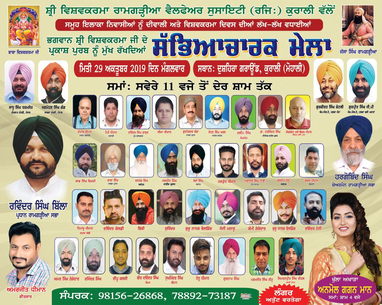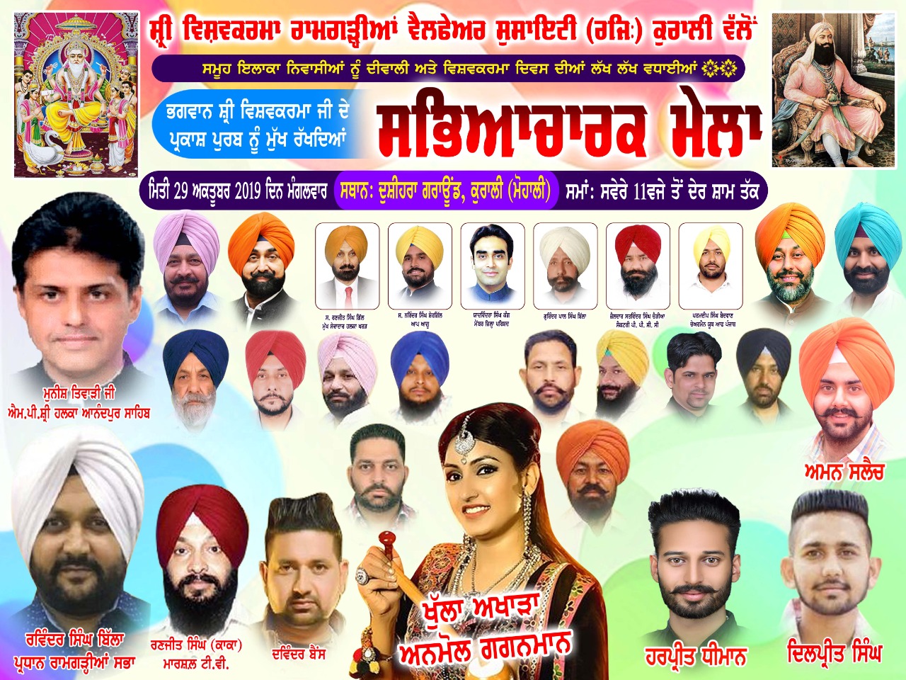 29 ਅਕਤੂਬਰ ਦਿਨ ਮੰਗਲਵਾਰ ਨੂੰ ਭਗਵਾਨ ਵਿਸ਼ਵਕਰਮਾ ਡੇ ਮੌਕੇ ਰਾਮਗੜ੍ਹੀਆ ਵੈਲਫੇਅਰ ਸੁਸਾਇਟੀ ਦੇ ਪ੍ਰਧਾਨ ਰਵਿੰਦਰ ਬਿੱਲਾ ਦੀ ਦੇਖ ਰੇਖ ਹੇਠ ਸਭਿਆਚਾਰਕ ਮੇਲਾ ਕੁਰਾਲੀ ਦੇ ਦੁਸਹਿਰਾ ਗਰਾਉਂਡ ਵਿਖੇ ਕਰਇਆ ਜਾ ਰਿਹਾ ਹੈ | ਸਭਾ ਦੇ ਚੇਅਰਮੈਨ ਹਰਗੋਬਿੰਦ ਸਿੰਘ ਨੇ ਦੱਸਿਆ ਕਿ ਪ੍ਰਸਿੱਧ ਗਾਇਕਾ ਅਨਮੋਲ ਗਗਨ ਮਾਨ ਤੇ ਹੋਰ ਕਲਾਕਾਰ ਸ਼ਾਮ 4:00 ਵਜੇ ਲੋਕਾਂ ਦੇ ਮਨੋਰੰਜਨ ਲਈ ਖੁਲਾ ਅਖਾੜਾ ਪੇਸ਼ ਕਰਨਗੇ । ਖਜ਼ਾਨਚੀ ਹੈਪੀ ਧੀਮਾਨ ਅਨੁਸਾਰ ਪ੍ਰੋਗਰਾਮ ਦੇ ਮੁੱਖ ਮਹਿਮਾਨ ਮਨੀਸ਼ ਤਿਵਾੜੀ ਐਮ ਪੀ ਸ੍ਰੀ ਅਨੰਦਪੁਰ ਸਾਹਿਬ ਹੋਣਗੇ | ਸਮਾਂ ਰੋਸ਼ਨ ਸਾਧੂ ਸਿੰਘ ਧਰਮਸੋਤ ਜੰਗਲਾਤ ਮੰਤਰੀ ਪੰਜਾਬ ਅਤੇ ਇਨਾਮ ਵੰਡ ਜਗਮੋਹਨ ਸਿੰਘ ਕੰਗ ਸਾਬਕਾ ਮੰਤਰੀ ਪੰਜਾਬ ਕਰਨਗੇ | ਗੁਰੂ ਕਾ ਲੰਗਰ ਅਟੁੱਟ ਵਰਤੇਗਾ |