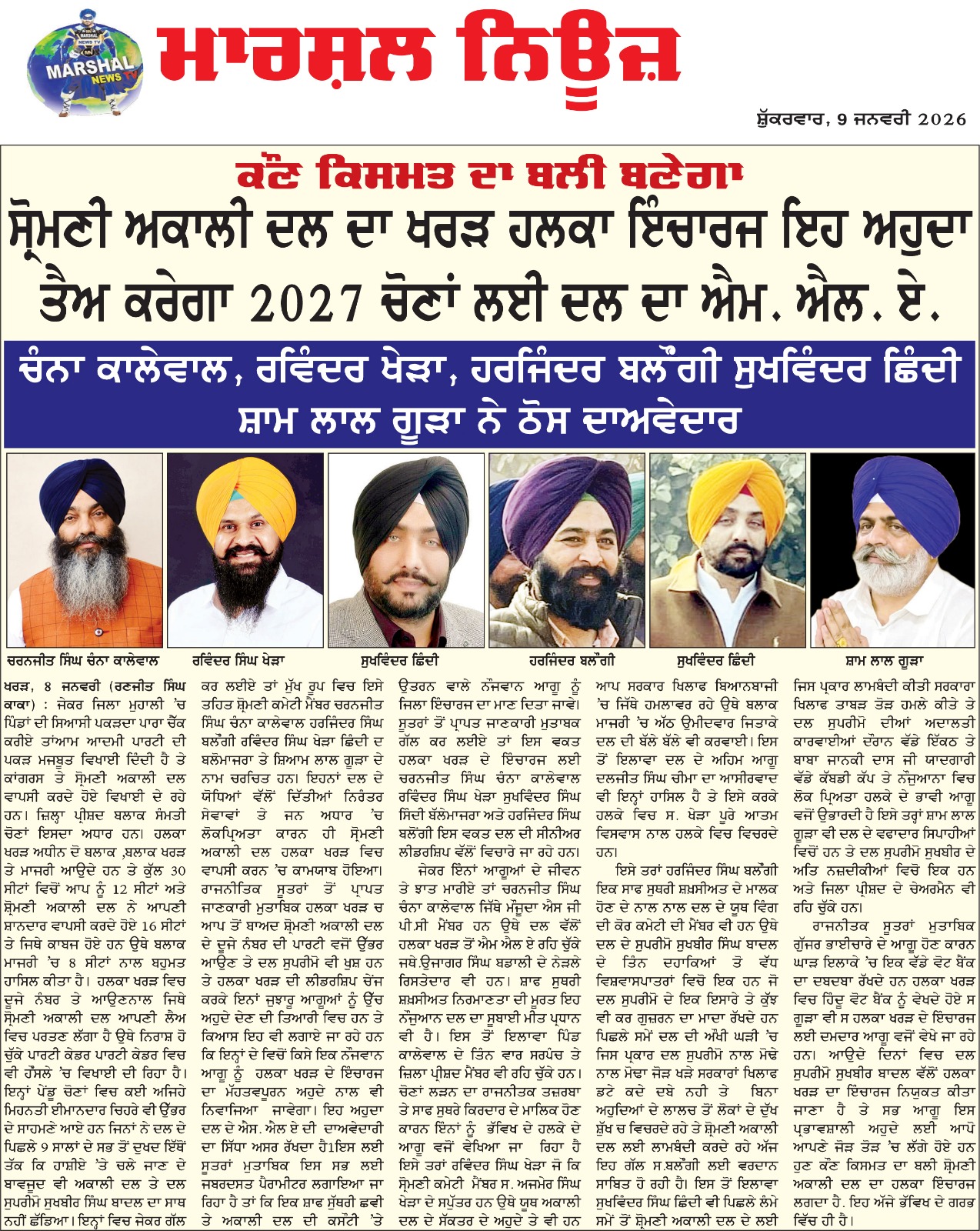 ਆਉਦੇ ਦਿਨਾਂ ਵਿਚ ਦਲ ਸੁਪਰੀਮੋ ਸੁਖਬੀਰ ਬਾਦਲ ਵੱਲੋਂ ਹਲਕਾ ਖਰੜ ਦਾ ਇੰਚਾਰਜ ਨਿਯੁਕਤ ਕੀਤਾ ਜਾਣਾ ਹੈ ਤੇ ਸਭ ਆਗੂ ਇਸ ਪ੍ਰਭਾਵਸ਼ਾਲੀ ਅਹੁਦੇ ਲਈ ਆਪੋ ਆਪਣੇ ਜੋੜ ਤੋੜ ਚ ਲੱਗੇ ਹੋਏ ਹਨ ਹੁਣ ਕੌਣ ਕਿਸਮਤ ਦਾ ਬਲੀ ਸ਼੍ਰੋਮਣੀ ਅਕਾਲੀ ਦਲ ਦਾ ਹਲਕਾ ਇੰਚਾਰਜ ਲਗਦਾ ਹੈ ਇਹ ਅਜੇ ਭੱਵਿਖ ਦੇ ਗਰਭ ਵਿੱਚ ਹੀ ਹੈ1