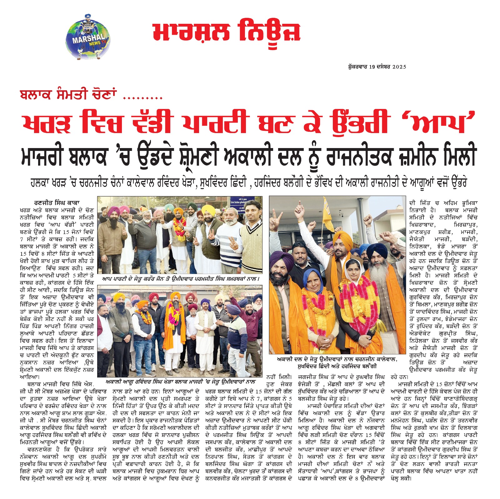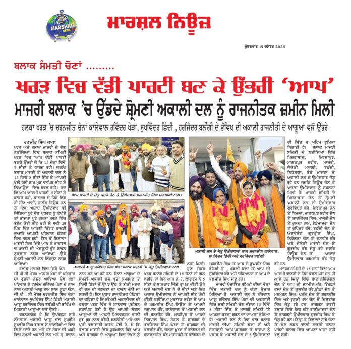 ਖਰੜ ਅਤੇ ਬਲਾਕ ਮਾਜਰੀ ਦੇ ਚੋਣ ਨਤੀਜ਼ਿਆਂ ਵਿਚ ਬਲਾਕ ਸਮਿਤੀ ਖਰੜ ਵਿਚ ‘ਆਪ ਵੱਡੀ’ ਪਾਰਟੀ ਬਣਕੇ ਉੱਭਰੀ ਜੋ ਕਿ 15 ਜੋਨਾਂ ਵਿਚੋਂ 7 ਸੀਟਾਂ ਤੇ ਕਾਬਜ਼ ਰਹੀ1ਜਦਕਿ ਬਲਾਕ ਮਾਜਰੀ ਤੋਂ ਅਕਾਲੀ ਦਲ ਨੇ 15 ਵਿਚੋਂ 8 ਸੀਟਾਂ ਜਿੱਤ ਕੇ ਆਪਣੀ ਖੋਈ ਹੋਈ ਸ਼ਾਖ ਮੁੜ ਵਾਪਿਸ ਲੀਹ ਤੇ ਲਿਆਉਣ ਵਿੱਚ ਸਫਲ ਰਹੀ1 ਜਦ ਕਿ ਆਮ ਆਦਮੀ ਪਾਰਟੀ 5 ਸੀਟਾਂ ਤੇ ਕਾਬਜ਼ ਰਹੀ ,ਕਾਂਗਰਸ ਦੇ ਹਿੱਸੇ ਇੱਕ ਹੀ ਸੀਟ ਆਈ, ਜਦਕਿ ਤਿਉੜ ਜੋਨ ਤੋਂ ਇਕ ਅਜ਼ਾਦ ਉਮੀਦਵਾਰ ਵੀ ਜਿੱਤਿਆ ਪੂਰੇ ਚੋਣ ਪ੍ਰਕਰਣ ਨੂੰ ਵੇਖੀਏ ਤਾਂ ਭਾਜਪਾ ਪੂਰੇ ਹਲਕਾ ਖਰੜ ਵਿੱਚ ਬੇਸ਼ੱਕ ਕੋਈ ਸੀਟ ਨਹੀਂ ਲੈ ਸਕੀ ਪਰ ਪਿੰਡ ਪਿੰਡ ਆਪਣੀ ਨਿੱਗਰ ਹਾਜ਼ਰੀ ਲੁਆਕੇ ਆਪਣੀ ਪਹਿਚਾਣ ਛੱਡਣ ਵਿਚ ਸਫਲ ਰਹੀ1 ਇਸ ਤੋਂ ਇਲਾਵਾ ਮਾਜਰੀ ਵਿਚ ਜਿੱਥੇ ਆਪ ਤੇ ਕਾਂਗਰਸ ਚ ਪਾਰਟੀ ਦੀ ਅੰਦਕੂਨੀ ਫੁੱਟ ਕਾਰਨ ਨੁਕਸਾਨ ਨਜ਼ਰ ਆਇਆ ,ਉਥੇ ਸ਼੍ਰੋਮਣੀ ਅਕਾਲੀ ਦਲ ਇੱਕਜੁੱਟ ਨਜ਼ਰ ਆਇਆ।
