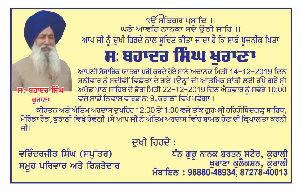 ਕੁਰਾਲੀ 18 ਦਸੰਬਰ () : ਟਕਸਾਲੀ ਅਕਾਲੀ ਆਗੂ ਜਥੇਦਾਰ ਬਹਾਦਰ ਸਿੰਘ ਖੁਰਾਣਾ ਦੇ ਅਕਾਲ ਚਲਾਣੇ ਕਾਰਨ ਇਲਾਕੇ ਦੀਆਂ ਰਾਜਨੀਤਕ, ਸਮਾਜਿਕ ਸਫਾਂ ਵਿੱਚ ਸੋਗ ਪਾਇਆ ਜਾ ਰਿਹਾ ਹੈ। ਇਸ ਮੌਕੇ ਅਕਾਲੀ ਦਲ ਹਲਕਾ ਖਰੜ ਦੇ ਮੁੱਖ ਸੇਵਾਦਾਰ ਰਣਜੀਤ ਸਿੰਘ ਗਿੱਲ ਕਿਹਾ ਕਿ ਉਨ੍ਹਾਂ ਦੀ ਬੇਵਕਤੀ ਮੌਤ ਕਾਰਨ ਇਲਾਕੇ ਦੀਆਂ ਰਾਜਨੀਤਕ , ਧਾਰਮਿਕ ਤੇ ਸਮਾਜਿਕ ਸੰਸਥਾਵਾਂ ਨੂੰ ਨਾ ਪੂਰਾ ਹੋਣ ਵਾਲਾ ਵੱਡਾ ਘਾਟਾ ਦੱਸਿਆ। ਇਸ ਮੌਕੇ ਪਰਿਵਾਰ ਦੇ ਨਾਲ ਜੈਲਦਾਰ ਸਤਵਿੰਦਰ ਸਿੰਘ ਚੈੜੀਆ ਸਕੱਤਰ ਪੰਜਾਬ ਕਾਂਗਰਸ, ,ਟਕਸਾਲੀ ਅਕਾਲੀਦਲ ਦੇ ਮੀਤ ਪ੍ਰਧਾਨ ਸਾਬਕਾ ਵਿਧਾਇਕ ਜਥੇਦਾਰ ਉਜਾਗਰ ਸਿੰਘ ਬਡਾਲੀਚੈਅਰਮੈਨ ਨਰਿੰਦਰ ਸਿੰਘ ਮਾਵੀ, ਜਥੇਦਾਰ ਅਜਮੇਰ ਸਿੰਘ ਖੇੜਾ ਮੈਬਰ ਐਸ ਜੀ ਪੀ ਸੀ, ਚਰਨਜੀਤ ਸਿੰਘ ਚੰਨਾ ਮੈਬਰ ਐਸਜੀਪੀਸੀ, ਰਜਿੰਦਰ ਸਿੰਘ ਰਾਜੂ ਸੀਨੀਅਰ ਕਾਂਗਰਸੀ ਆਗੂ ਅਮਰੀਕਾ, ਨਗਰ ਕੌਂਸਲ ਪ੍ਰਧਾਨ ਕਿਸ਼ਨਾ ਦੇਵੀ, ਦਵਿੰਦਰ ਸਿੰਘ ਠਾਕੁਰ ਐਮ ਸੀ, ਕੁਲਵੰਤ ਕੌਰ ਪਾਬਲਾ ਐਮ ਸੀ, ਇੰਦਰਬੀਰ ਸਿੰਘ ਪ੍ਰਧਾਨ ਗੁਰੂਦੁਆਰਾ ਸਾਹਿਬ ਸਬਜ਼ੀ ਮੰਡੀ, ਜਥੇਦਾਰ ਮਨਜੀਤ ਸਿੰਘ ਮੁੰਧੋ, ਹਰਮਿੰਦਰ ਸਿੰਘ ਕਾਲਾ ਪ੍ਰਧਾਨ ਅਕਾਲੀ ਦਲ ਸ਼ਹਿਰੀ, ਕੌਂਸਲਰ ਰਾਜਦੀਪ ਸਿੰਘ ਹੈਪੀ, ਕੌਂਸਲਰ ਵਿਨੀਤ ਕਾਲੀਆ, ਸੁਖਜਿੰਦਰ ਸਿੰਘ ਸੋਢੀ, ਸਰਪੰਚ ਬਲਕਾਰ ਸਿੰਘ ਭੰਗੂ, ਪ੍ਰਧਾਨ ਸਵਰਨ ਸਿੰਘ, ਸੁਰਿੰਦਰ ਸਿੰਘ ਖਾਲਸਾ ਨੇ ਦੁੱਖ ਦਾ ਪ੍ਰਗਟਾਵਾ ਕੀਤਾ। ਸਵ: ਬਹਾਦਰ ਸਿੰਘ ਖੁਰਾਣਾ ਦੇ ਬੇਟੇ ਵਰਿੰਦਰਜੀਤ ਸਿੰਘ ਲਾਲੀ ਨੇ ਦੱਸਿਆ ਕਿ ਉਨ੍ਹਾਂ ਦੇ ਪਿਤਾ ਦੇ ਨਮਿੱਤ ਅੰਤਿਮ ਅਰਦਾਸ ਤੇ ਭੋਗ 22 ਦਸੰਬਰ ਦਿਨ ਐਤਵਾਰ ਨੂੰ ਗੁ: ਹਰਗੋਬਿੰਦਗੜ੍ਹ ਸਾਹਿਬ ਜੀ ਮੋਰਿੰਡਾ ਰੋਡ ਕੁਰਾਲੀ ਵਿਖੇ 12ਤੋਂ 1 ਵੱਜੇ ਤੱਕ ਪਾਇਆ ਜਾਵੇਗਾ।
