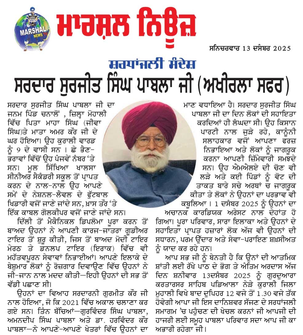 ਆਪ ਸਭ ਜੀ ਨੂੰ ਬੇਨਤੀ ਹੈ ਕਿ ਉਨਾਂ ਦੀ ਆਤਮਿਕ ਸ਼ਾਂਤੀ ਲਈ ਰੱਖੇ ਪਾਠ ਦੇ ਭੋਗ ਤੇ ਅੰਤਿਮ ਅਰਦਾਸ ਅੱਜ ਦਿਨ ਸ਼ਨੀਵਾਰ 13ਦਸੰਬਰ 2025 ਨੂੰ ਗੁਰਦੁਆਰਾ ਕਰਤਾਰਸਰ ਸਾਹਿਬ ਪਡਿਆਲਾ ਨੇੜੇ ਕੁਰਾਲੀ ਜਿਲਾ ਮੁਹਾਲੀ ਵਿਖੇ ਬਾਦ ਦੁਪਿਹਰ 12 ਵਜੇ ਤੋਂ 1.30 ਵਜੇ ਤੱਕ ਹੋਵੇਗੀ ਆਪਾ ਜੀ ਇਸ ਦਾਨਿਸ਼ਵਰ ਸੱਜਣ ਦੇ ਸਰਧਾਂਜਲੀ ਸਮਾਗਮ ‘ਚ ਪਹੁੰਚਣ ਦੀ ਖੇਚਲ ਕਰਨਾਂ ਜੀ ਆਪਜੀ ਦੀ ਹਾਜਰੀ ਲਈ ਸਮੂਹ ਪਾਬਲਾ ਪਰਿਵਾਰ ਸਦਾ ਆਪ ਜੀ ਕਾ ਅਭਾਰੀ ਰਹੇਗਾ ਜੀ1