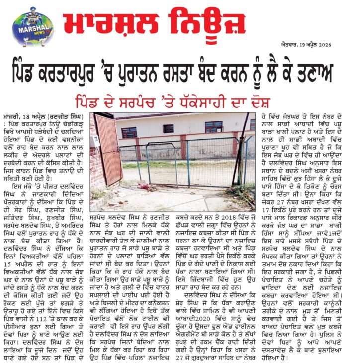 ਪਿੰਡ ਦੇ ਸਰਪੰਚ ਤੇ ਧੱਕੇਸਾਹੀ ਦਾ ਦੋਸ਼ ਮਾਜਰੀ 18 ਅਪ੍ਰੈਲ ( ਰਣਜੀਤ ਸਿੰਘ)ਪਿੰਡ ਕਰਤਾਰਪੁਰ ਨਿਊ ਚੰਡੀਗੜ੍ਹ. ਵਿਖੇ ਆਪਸੀ ਧੜੇਬੰਦੀ ਦੇ ਚਲਦਿਆਂ ਹੋਇਆ ਪਿੰਡ ਦੇ ਕਈ ਵਸਨੀਕਾਂ ਵਲੋਂ ਰਾਹ ਬੰਦ ਕਰਨ ਨਾਲ ਲਾਲ ਲਕੀਰ ਦੇ ਅੰਦਰਲੇ ਪਲਾਟਾਂ ਦੀ ਦਰਬੰਦੀ ਕਰਨ ਦੀ ਕੋਸਿਸ਼ ਕੀਤੀ ਹੈ। ਜਿਸ ਕਾਰਨ ਪਿੰਡ ਵਿਚ ਤਨਾਉ ਦੀ ਸਥਿਤੀ ਬਣੀ ਹੋਈ ਹੈ। । ਇਸ ਮੌਕੇ ਤੇ ਪੀੜਤ ਦਲਵਿੰਦਰ ਸਿੰਘ ਨੇ ਜਾਣਕਾਰੀ ਦਿੰਦਿਆਂ ਪੱਤਰਕਾਰਾਂ ਨੂੰ ਦੱਸਿਆ ਕਿ ਪਿੰਡ ਦੇ ਹੀ ਸੇਰ ਸਿੰਘ, ਰਣਜੀਤ ਸਿੰਘ, ਜਤਿੰਦਰ ਸਿੰਘ, ਸੁਖਬੀਰ ਸਿੰਘ, ਸਰਪੰਚ ਬਲਦੇਵ ਸਿੰਘ, ਤੈ ਅਮਰਿੰਦਰ ਸਿੰਘ ਵਲੋਂ ਪੁਰਾਤਨ ਰਾਹ ਨੂੰ ਧੱਕੇ ਦੇ ਨਾਲ ਬੰਦ ਕੀਤਾ ਗਿਆ ਹੈ। ਦਲਵਿੰਦਰ ਸਿੰਘ ਨੇ ਦੱਸਿਆ ਕਿ ਇਨਾਂ ਵਿਅਕਤੀਆਂ ਵੱਲੋਂ ਪਹਿਲਾ 15 ਅਪਰੈਲ ਦੀ ਰਾਤ ਨੂੰ ਇਨਾਂ ਵਿਅਕਤੀਆਂ ਵੱਲੋਂ ਧੱਕੇ ਨਾਲ ਜੰਝ ਘਰ ਦੇ ਨਾਲ ਉਨਾਂ ਦੇ ਪਸ਼ੂ ਬਾੜੇ ਨੂੰ ਜਾਂਦੇ ਰਸਤੇ ਨੂੰ ਧੱਕੇ ਨਾਲ ਬੰਦ ਕਰਨ ਦੀ ਕੋਸਿਸ ਕੀਤੀ ਗਈ ਜਦੋਂ ਉਹ ਰੋਕਣ ਲਈ ਪੁੱਜੇ ਤਾਂ ਝਗੜੇ ਤੇ ਉਤਾਰੂ ਹੋ ਗਏ ਤਾਂ ਇੰਨੇ ਵਿਚ ਕਿਸੇ ਪਿੰਡ ਵਾਸੀ ਨੇ 11 2 ਤੇ ਕਾਲ ਕਰ ਕੇ ਪੀਸੀਆਰ ਬ ਬੁਲਾ ਲਈ ਗਿਆ ਤੇ ਦੋਵਾਂ ਪਿਰਾ ਨੂੰ ਥਾਣੇ ਆਉਣ ਲਈ ਕਿਹਾ ਦਲਵਿੰਦਰ ਸਿੰਘ ਨੇ ਦੋਸ ਲਾਇਆ ਕਿ ਦੂਜੇ ਦਿਨ ਜਦੋਂ ਉਹ ਥਾਣੇ ਗਏ ਹੋਏ ਸਨ ਤਾਂ ਪਿੰਡ ਦੇ ਸਰਪੰਚ ਬਲਦੇਵ ਸਿੰਘ ਨੇ ਰਣਜੀਤ ਸਿੰਘ ਤੇ ਹੋਰਾਂ ਨਾਲ ਮਿਲਕੇ ਧੱਕੇ ਨਾਲ ਜੰਝ ਘਰ ਦੀ ਜਾਲੀ ਵਾਲੀ ਚਾਰਦੀਵਾਰੀ ਤੋੜ ਕੇ ਜਾਲੀਆਂ ਨਾਲ ਪੁਰਾਤਨ ਰਾਹ ਜੋ ਸਾਡੇ ਪਸ਼ੂ ਬਾੜੇ ਤੇ ਹੋਰਨਾਂ ਦੇ ਪਲਾਟਾਂ ਬਾੜਿਆਂ ਵੱਲ ਜਾਂਦਾਂ ਸੀ ਬੰਦ ਕਰ ਦਿਤਾ1ਉਹਨਾਂ ਕਿਹਾ ਕਿ ਜੋ ਰਾਹ ਧੱਕੇ ਨਾਲ ਬੰਦ ਕੀਤਾ ਗਿਆ ਉਹ ਸਾਡੇ ਪਸ਼ੂ ਬਾੜੇ ਨੂੰ ਜਾਂਦਾ ਹੈ ਅਤੇ ਗਲੀ ਦੇ ਵਿੱਚ ਵਾਟਰ ਸਪਲਾਈ ਦੀ ਪਾਈਪ ਪਈ ਹੋਈ ਹੈ ਅਤੇ ਬਿਜਲੀ ਦੇ ਮੀਟਰ ਦਾ ਕਨੈਕਸ਼ਨ ਵੀ ਲੱਗਿਆ ਹੋਇਆ ਹੈ ਇਥੋਂ ਤੱਕ ਪੰਚਾਇਤ ਵੱਲੋਂ ਲੋਕ ਟਾਈਲ ਵੀ ਕਰਾਈ ਵੀ ਇਸੇ ਰਾਹ ਉੱਪਰ ਲੱਗੀ ਹੈ ਦਲਵਿੰਦਰ ਸਿੰਘ ਨੇ ਦੋਸ਼ ਲਾਇਆ ਕਿ ਸਰਪੰਚ ਜਿਨਾਂ ਬੰਦਿਆਂ ਨਾਲ ਮਿਲ ਕੇ ਧੱਕਾ ਕਰ ਰਿਹਾ ਕਰ ਰਿਹਾ ਉਹ ਪਿੰਡ ਵਿੱਚ ਪਹਿਲਾਂ ਨਜਾਇਜ਼ ਕਬਜ਼ੇ ਕਰਦੇ ਸਨ ਤੇ 2018 ਵਿੱਚ ਜੋ ਛੱਪੜ ਵਾਲੀ ਜਗ੍ਹਾ ਵਿੱਚ ਉਹਨਾਂ ਨੇ ਨਜਾਇਜ਼ ਕਬਜ਼ਾ ਕੀਤਾ ਸੀ ਪਿੰਡ ਨੇ ਧਰਨਾ ਲਾ ਕੇ ਉਹਨਾਂ ਦਾ ਨਜਾਇਜ਼ ਕਬਜ਼ਾ ਹਟਵਾਇਆ ਸੀ ਅਤੇ ਪਿੰਡ ਵਿੱਚੋਂ ਘਰ ਭਰਤੀ ਪੈਸੇ ਇਕੱਠੇ ਕਰਕੇ ਪਿੰਡ ਦੇ ਗੰਦੇ ਪਾਣੀ ਦੇ ਨਿਕਾਸ ਲਈ ਪੱਕਾ ਨਾਲਾ ਬਣਾਇਆ ਗਿਆ ਸੀ। ਇਸੇ ਜਿੱਦਬਾਜੀ ਵਿੱਚ ਹੁਣ ਉਹ ਸਾਡਾ ਰਾਹ ਬੰਦ ਕਰ ਰਹੇ ਹਨ।1ਦਲਵਿੰਦਰ ਸਿੰਘ ਨੇ ਦੱਸਿਆ ਕਿ ਸ਼ੇਰ ਸਿੰਘ ਜੋ ਕਿ ਧੱਕਾ ਕਰਾਉਣ ਵਾਲੇ ਵਿੱਚ ਸ਼ਾਮਿਲ ਹੈ ਵੀ ਆਪਣੀ ਆਬਾਦੀ2020 ਵਿੱਚ ਸਾਨੂੰ ਵੇਚ ਚੁੱਕਾ ਹੈ ਉਸਦਾ ਫੁਲ ਐਂਡ ਫਾਈਨਲ ਐਗਰੀਮੈਂਟ ਬੀ ਸਾਡੇ ਕੋਲ ਹੈ ਤੇ ਲੱਖਾਂ ਰੁਪਏ ਦੀ ਰਕਮ ਚੈੱਕ ਰਾਹੀ ਦਿੱਤੀ ਗਈ ਹੈ ਉਨ੍ਹਾਂ ਕਿਹਾ ਕਿ ਖਸਰਾ ਨੰ 27 ਜੋ ਗੁਰਦੁਆਰਾ ਸਾਹਿਬ ਦਾ ਨੰਬਰ ਹੈ ਵਿੱਚ ਜੰਝਘਰ ਤੇ ਇਸ ਨੰਬਰ ਦੇ ਨਾਲ ਸਾਡੀ ਆਬਾਦੀ ਵਿੱਚ ਪਸ਼ੂ ਬਾੜਾ ਖਾਲੀ ਪਲਾਟ ਹੈ ਅਤੇ ਇਸ ਦੇ ਨਾਲ ਹੀ ਸਾਡੀ ਅਬਾਦੀ ਵਿੱਚ ਪੁਰਾਣਾ ਖੂਹ ਵੀ ਸਥਿਤ ਹੈ ਜੋ ਕਿ ਇਸ ਜੰਝ ਘਰ ਦੇ ਵਿੱਚ ਹੀ ਆਉਂਦਾ ਹੈ ਦਲਵਿੰਦਰ ਸਿੰਘ ਅਨੁਸਾਰ ਇਸ ਸਥਾਨ ਦੇ ਬਦਲੇ ਅਸੀਂ ਖਸਰਾ ਨੰਬਰ ਸਾਹਿਬ ਵਿੱਚੋਂ ਕੁਝ ਹਿੱਸਾ ਲੈ ਕੇ ਦੂਜੇ ਪਾਸੇ ਹਿੱਸਾ ਦੇ ਕੇ ਤਿਕੋਣ ਨੂੰ ਚੋਰਸ ਬਣਾ ਦਿੱਤਾ ਸੀ 1 ਉਨਾ ਕਿਹਾ ਕਿ ਜੇਕਰ 27 ਨੰਬਰ ਖਸਰਾ ਦੱਖਣ ਵੱਲ 17 ਇਕੱਠੇ ਪੂਰੇ ਕਰਨੇ ਹਨ ਤਾਂ ਦੂਜੇ ਪਾਸੇ ਮਾਲ ਰਿਕਾਰਡ ਅਨੁਸਾਰ ਜੀਰੋ ਕਰਕੇ ਜੰਝ ਘਰ ਦਾ ਸਾਡਾ ਬਾਕੀ 
