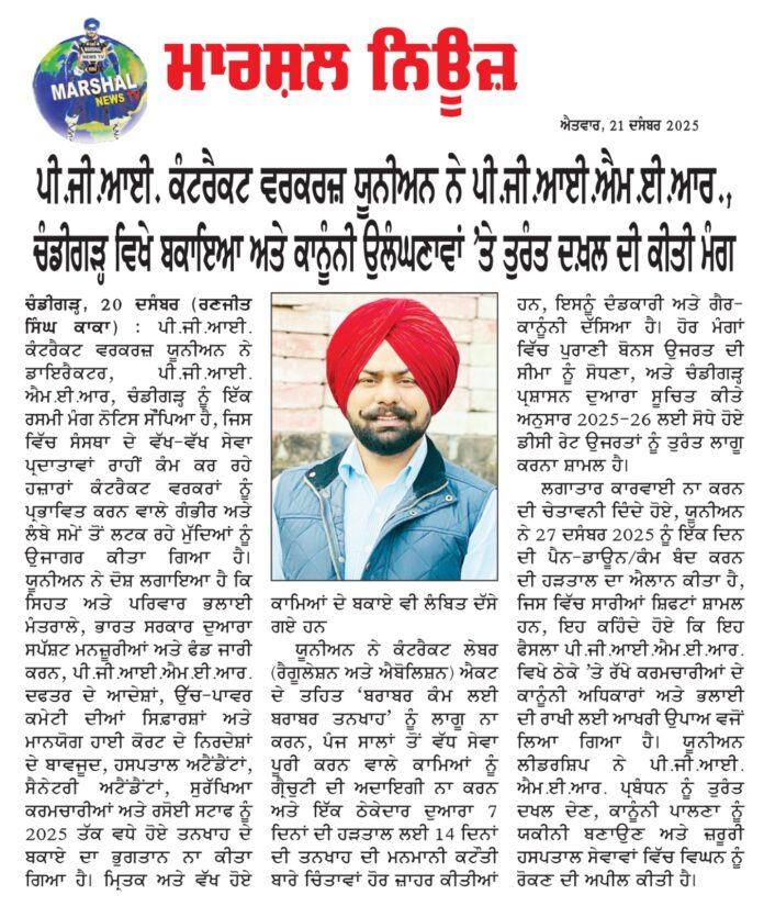 ਚੰਡੀਗੜ੍ਹ,21ਦਸੰਬਰ ( ਰਣਜੀਤ ਸਿੰਘ ਕਾਕਾ)ਪੀ.ਜੀ.ਆਈ. ਕੰਟਰੈਕਟ ਵਰਕਰਜ਼ ਯੂਨੀਅਨ ਨੇ ਡਾਇਰੈਕਟਰ, ਪੀ.ਜੀ.ਆਈ.ਐਮ.ਈ.ਆਰ, ਚੰਡੀਗੜ੍ਹ ਨੂੰ ਇੱਕ ਰਸਮੀ ਮੰਗ ਨੋਟਿਸ ਸੌਂਪਿਆ ਹੈ, ਜਿਸ ਵਿੱਚ ਸੰਸਥਾ ਦੇ ਵੱਖ-ਵੱਖ ਸੇਵਾ ਪ੍ਰਦਾਤਾਵਾਂ ਰਾਹੀਂ ਕੰਮ ਕਰ ਰਹੇ ਹਜ਼ਾਰਾਂ ਕੰਟਰੈਕਟ ਵਰਕਰਾਂ ਨੂੰ ਪ੍ਰਭਾਵਿਤ ਕਰਨ ਵਾਲੇ ਗੰਭੀਰ ਅਤੇ ਲੰਬੇ ਸਮੇਂ ਤੋਂ ਲਟਕ ਰਹੇ ਮੁੱਦਿਆਂ ਨੂੰ ਉਜਾਗਰ ਕੀਤਾ ਗਿਆ ਹੈ।