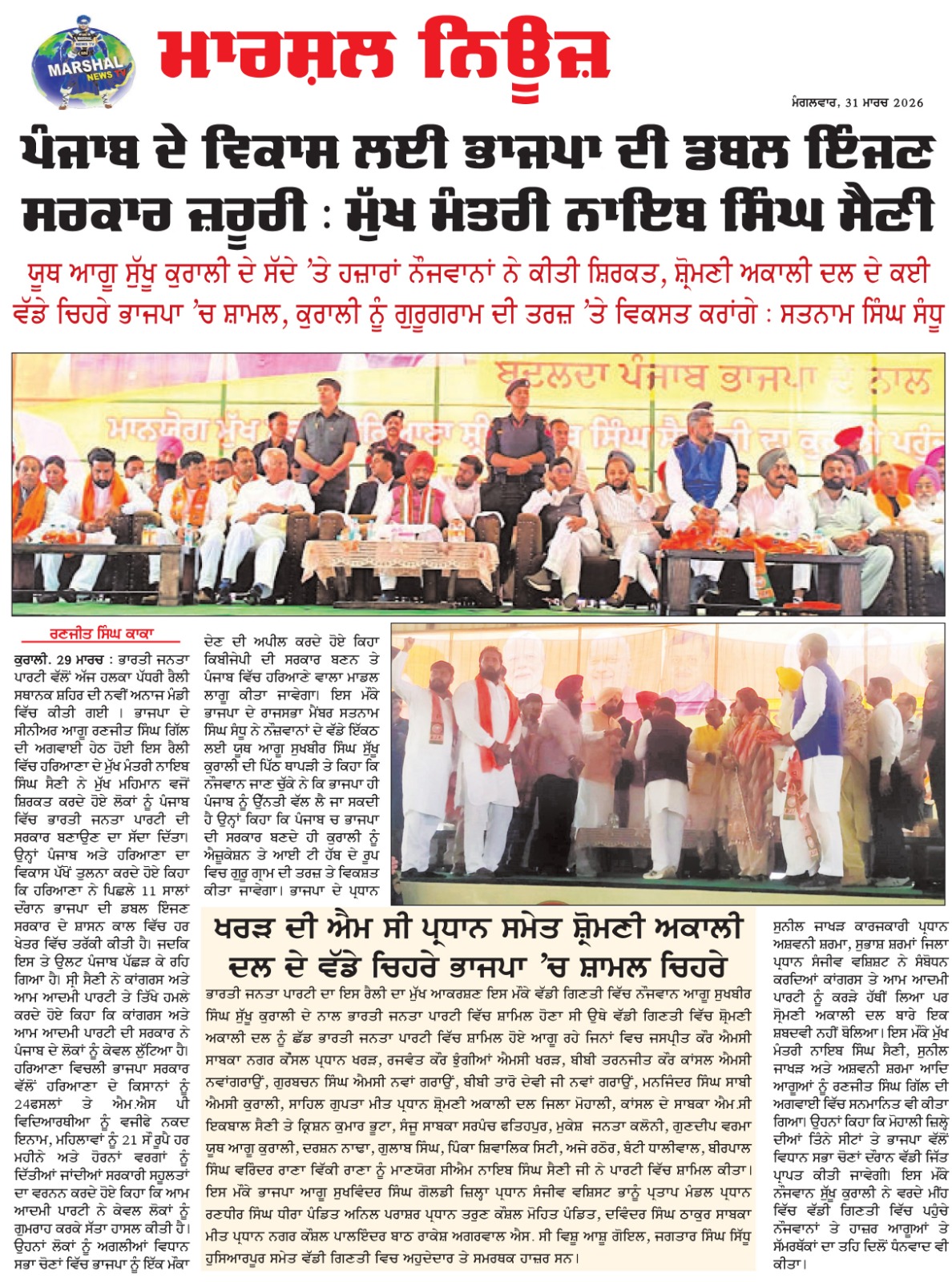 ਕੁਰਾਲੀ 29 ਮਾਰਚ ( ਰਣਜੀਤ ਸਿੰਘ ਕਾਕਾ)ਭਾਰਤੀ ਜਨਤਾ ਪਾਰਟੀ ਵੱਲੋਂ ਅੱਜ ਹਲਕਾ ਪੱਧਰੀ ਰੈਲੀ ਸਥਾਨਕ ਸ਼ਹਿਰ ਦੀ ਨਵੀਂ ਅਨਾਜ ਮੰਡੀ ਵਿੱਚ ਕੀਤੀ ਗਈ । ਭਾਜਪਾ ਦੇ ਸੀਨੀਅਰ ਆਗੂ ਰਣਜੀਤ ਸਿੰਘ ਗਿੱਲ ਦੀ ਅਗਵਾਈ ਹੇਠ ਹੋਈ ਇਸ ਰੈਲੀ ਵਿੱਚ ਹਰਿਆਣਾ ਦੇ ਮੁੱਖ ਮੰਤਰੀ ਨਾਇਬ ਸਿੰਘ ਸੈਣੀ ਨੇ ਮੁੱਖ ਮਹਿਮਾਨ ਵਜੋਂ ਸ਼ਿਰਕਤ ਕਰਦੇ ਹੋਏ ਲੋਕਾਂ ਨੂੰ ਪੰਜਾਬ ਵਿੱਚ ਭਾਰਤੀ ਜਨਤਾ ਪਾਰਟੀ ਦੀ ਸਰਕਾਰ ਬਣਾਉਣ ਦਾ ਸੱਦਾ ਦਿੱਤਾ । ਉਨ੍ਹਾਂ ਪੰਜਾਬ ਅਤੇ ਹਰਿਆਣਾ ਦਾ ਵਿਕਾਸ ਪੱਖੋਂ ਤੁਲਨਾ ਕਰਦੇ ਹੋਏ ਕਿਹਾ ਕਿ ਹਰਿਆਣਾ ਨੇ ਪਿਛਲੇ 11 ਸਾਲਾਂ ਦੌਰਾਨ ਭਾਜਪਾ ਦੀ ਡਬਲ ਇੰਜਣ ਸਰਕਾਰ ਦੇ ਸ਼ਾਸਨ ਕਾਲ ਵਿੱਚ ਹਰ ਖੇਤਰ ਵਿੱਚ ਤਰੱਕੀ ਕੀਤੀ ਹੈ। ਜਦਕਿ ਇਸ ਤੇ ਉਲਟ ਪੰਜਾਬ ਪੱਛੜ ਕੇ ਰਹਿ ਗਿਆ ਹੈ। ਸ੍ਰੀ ਸੈਣੀ ਨੇ ਕਾਂਗਰਸ ਅਤੇ ਆਮ ਆਦਮੀ ਪਾਰਟੀ ਤੇ ਤਿੱਖੇ ਹਮਲੇ ਕਰਦੇ ਹੋਏ ਕਿਹਾ ਕਿ ਕਾਂਗਰਸ ਅਤੇ ਆਮ ਆਦਮੀ ਪਾਰਟੀ ਦੀ ਸਰਕਾਰ ਨੇ ਪੰਜਾਬ ਦੇ ਲੋਕਾਂ ਨੂੰ ਕੇਵਲ ਲੁੱਟਿਆ ਹੈ। ਹਰਿਆਣਾ ਵਿਚਲੀ ਭਾਜਪਾ ਸਰਕਾਰ ਵੱਲੋਂ ਹਰਿਆਣਾ ਦੇ ਕਿਸਾਨਾਂ ਨੂੰ 24ਫਸਲਾਂ ਤੇ ਐਮ.ਐਸ ਪੀ ਵਿਦਿਆਰਥੀਆ ਨੂੰ ਵਜੀਫੇ ਨਕਦ ਇਨਾਮ, ਮਹਿਲਾਵਾਂ ਨੂੰ 21 ਸੌ ਰੂਪੈ ਹਰ ਮਹੀਨੇ ਅਤੇ ਹੋਰਨਾਂ ਵਰਗਾਂ ਨੂੰ ਦਿੱਤੀਆਂ ਜਾਂਦੀਆਂ ਸਰਕਾਰੀ ਸਹੂਲਤਾਂ ਦਾ ਵਰਨਨ ਕਰਦੇ ਹੋਏ ਕਿਹਾ ਕਿ ਆਮ ਆਦਮੀ ਪਾਰਟੀ ਨੇ ਕੇਵਲ ਲੋਕਾਂ ਨੂੰ ਗੁਮਰਾਹ ਕਰਕੇ ਸੱਤਾ ਹਾਸਲ ਕੀਤੀ ਹੈ1ਉਹਨਾਂ ਲੋਕਾਂ ਨੂੰ ਅਗਲੀਆਂ ਵਿਧਾਨ ਸਭਾ ਚੋਣਾਂ ਵਿੱਚ ਭਾਜਪਾ ਨੂੰ ਇੱਕ ਮੌਕਾ ਦੇਣ ਦੀ ਅਪੀਲ ਕਰਦੇ ਹੋਏ ਕਿਹਾ ਕਿਬੀਜੇਪੀ ਦੀ ਸਰਕਾਰ ਬਣਨ ਤੇ ਪੰਜਾਬ ਵਿੱਚ ਹਰਿਆਣੇ ਵਾਲਾ ਮਾਡਲ ਲਾਗੂ ਕੀਤਾ ਜਾਵੇਗਾ। ਇਸੇ ਮੌਕੇ ਭਾਜਪਾ ਦੇ ਰਾਜਸਭਾ ਮੈਂਬਰ ਸਤਨਾਮ ਸਿੰਘ ਸੰਧੂ ਨੇ ਨੌਜ਼ਵਾਨਾਂ ਦੇ ਵੱਡੇ ਇੱਕਠ ਲਈਯੂਥ ਆਗੂ ਸੁਖਬੀਰ ਸਿੰਘ ਸੁੱਖੂ ਕੁਰਾਲੀ ਦੀ ਪਿੱਠ ਥਾਪੜੀ ਤੇ ਕਿਹਾ ਕਿ ਨੌਜਵਾਨ ਜਾਣ ਚੁੱਕੇ ਨੇ ਕਿ ਭਾਜਪਾ ਹੀ ਪੰਜਾਬ ਨੂੰ ਉੱਨਤੀ ਵੱਲ ਲੈ ਜਾ ਸਕਦੀ ਹੈ ਉਨ੍ਹਾਂ ਕਿਹਾਕਿ ਪੰਜਾਬ ਚ ਭਾਜਪਾ ਦੀ ਸਰਕਾਰ ਬਣਦੇ ਹੀ ਕੁਰਾਲੀ ਨੂੰ ਐਜ਼ੂਕੇਸ਼ਨ ਤੇ ਆਈ ਟੀ ਹੱਬ ਦੇ ਰੂਪ ਵਿਚ ਗੁਰੂ ਗ੍ਰਾਮ ਦੀ ਤਰਜ਼ ਤੇ ਵਿਕਸ਼ਤ ਕੀਤਾ ਜਾਵੇਗਾ1 ਭਾਜਪਾ ਦੇ ਪ੍ਰਧਾਨ ਸੁਨੀਲ ਜਾਖੜ ਕਾਰਜਕਾਰੀ ਪ੍ਰਧਾਨ ਅਸ਼ਵਨੀ ਸ਼ਰਮਾ, ਸੁਭਾਸ਼ ਸ਼ਰਮਾਂ ਜਿਲਾ ਪ੍ਰਧਾਨ ਸੰਜੀਵ ਵਸ਼ਿਸ਼ਟ ਨੇ ਸੰਬੋਧਨ ਕਰਦਿਆਂ ਕਾਂਗਰਸ ਤੇ ਆਮ ਆਦਮੀ ਪਾਰਟੀ ਨੂੰ ਕਰੜੇ ਹੱਥੀਂ ਲਿਆ ਪਰ ਸ੍ਰੋਮਣੀ ਅਕਾਲੀ ਦਲ ਬਾਰੇ ਇਕ ਸ਼ਬਦਵੀ ਨਹੀਂ ਬੋਲਿਆ 1ਇਸ ਮੌਕੇ ਮੁੱਖ ਮੰਤਰੀ ਨਾਇਬ ਸਿੰਘ ਸੈਣੀ, ਸੁਨੀਲ ਜਾਖੜ ਅਤੇ ਅਸ਼ਵਨੀ ਸ਼ਰਮਾ ਆਦਿ ਆਗੂਆਂ ਨੂੰ ਰਣਜੀਤ ਸਿੰਘ ਗਿੱਲ ਦੀ ਅਗਵਾਈ ਵਿੱਚ ਸਨਮਾਨਿਤ ਵੀ ਕੀਤਾ ਗਿਆ। ਉਹਨਾਂ ਕਿਹਾ ਕਿ ਮੋਹਾਲੀ ਜ਼ਿਲ੍ਹੇ ਦੀਆਂ ਤਿੰਨੇ ਸੀਟਾਂ ਤੇ ਭਾਜਪਾ ਵੱਲੋਂ ਵਿਧਾਨ ਸਭਾ ਚੋਣਾਂ ਦੌਰਾਨ ਵੱਡੀ ਜਿੱਤ ਪ੍ਰਾਪਤ ਕੀਤੀ ਜਾਵੇਗੀ। ਇਸ ਮੌਕੇ ਨੌਜਵਾਨ ਸੁੱਖੂ ਕੁਰਾਲੀ ਨੇ ਵਰਦੇ ਮੀਂਹ ਵਿੱਚ ਵੱਡੀ ਗਿਣਤੀ ਵਿੱਚ ਪਹੁੰਚੇ ਨੌਜਵਾਨਾਂ ਤੇ ਹਾਜ਼ਰ ਆਗੂਆਂ ਤੇ ਸਮਰਥੱਕਾਂ ਦਾ ਤਹਿ ਦਿਲੋਂ ਧੰਨਵਾਦ ਵੀ ਕੀਤਾ