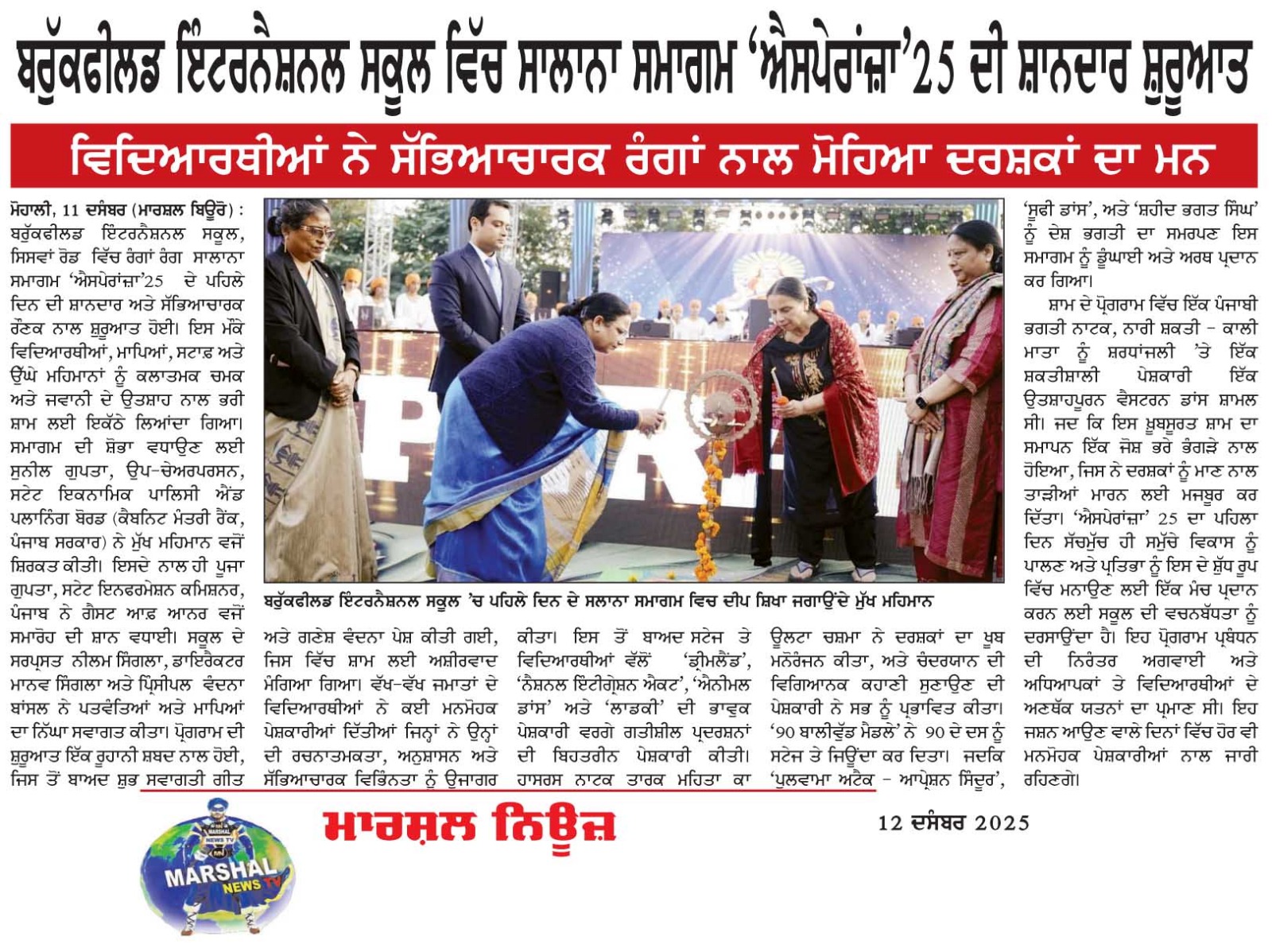 ਬਰੁੱਕਫੀਲਡ ਇੰਟਰਨੈਸ਼ਨਲ ਸਕੂਲ, ਸਿਸਵਾਂ ਰੋਡ ਵਿੱਚ ਰੰਗਾਂ ਰੰਗ ਸਾਲਾਨਾ ਸਮਾਗਮ ‘ਐਸਪੇਰਾਂਜ਼ਾ’25 ਦੇ ਪਹਿਲੇ ਦਿਨ ਦੀ ਸ਼ਾਨਦਾਰ ਅਤੇ ਸੱਭਿਆਚਾਰਕ ਰੌਣਕ ਨਾਲ ਸ਼ੁਰੂਆਤ ਹੋਈ। ਇਸ ਮੌਕੇ ਵਿਦਿਆਰਥੀਆਂ, ਮਾਪਿਆਂ, ਸਟਾਫ਼ ਅਤੇ ਉੱਘੇ ਮਹਿਮਾਨਾਂ ਨੂੰ ਕਲਾਤਮਕ ਚਮਕ ਅਤੇ ਜਵਾਨੀ ਦੇ ਉਤਸ਼ਾਹ ਨਾਲ ਭਰੀ ਸ਼ਾਮ ਲਈ ਇਕੱਠੇ ਲਿਆਂਦਾ ਗਿਆ। ਸਮਾਗਮ ਦੀ ਸ਼ੋਭਾ ਵਧਾਉਣ ਲਈ ਸੁਨੀਲ ਗੁਪਤਾ, ਉਪ-ਚੇਅਰਪਰਸਨ, ਸਟੇਟ ਇਕਨਾਮਿਕ ਪਾਲਿਸੀ ਐਂਡ ਪਲਾਨਿੰਗ ਬੋਰਡ (ਕੈਬਨਿਟ ਮੰਤਰੀ ਰੈਂਕ, ਪੰਜਾਬ ਸਰਕਾਰ) ਨੇ ਮੁੱਖ ਮਹਿਮਾਨ ਵਜੋਂ ਸ਼ਿਰਕਤ ਕੀਤੀ। ਇਸਦੇ ਨਾਲ ਹੀ ਪੂਜਾ ਗੁਪਤਾ, ਸਟੇਟ ਇਨਫਰਮੇਸ਼ਨ ਕਮਿਸ਼ਨਰ, ਪੰਜਾਬ ਨੇ ਗੈਸਟ ਆਫ਼ ਆਨਰ ਵਜੋਂ ਸਮਾਰੋਹ ਦੀ ਸ਼ਾਨ ਵਧਾਈ। ਸਕੂਲ ਦੇ ਸਰਪ੍ਰਸਤ ਨੀਲਮ ਸਿੰਗਲਾ, ਡਾਇਰੈਕਟਰ ਮਾਨਵ ਸਿੰਗਲਾ ਅਤੇ ਪ੍ਰਿੰਸੀਪਲ ਵੰਦਨਾ ਬਾਂਸਲ ਨੇ ਪਤਵੰਤਿਆਂ ਅਤੇ ਮਾਪਿਆਂ ਦਾ ਨਿੱਘਾ ਸਵਾਗਤ ਕੀਤਾ।