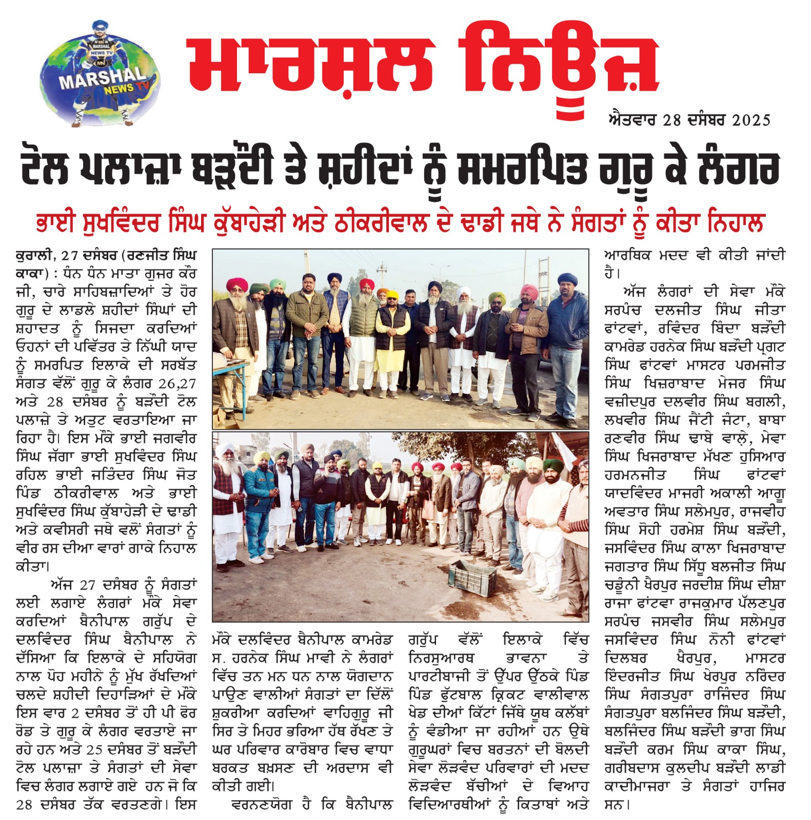 ਅੱਜ 26 7 ਦਸੰਬਰ ਨੂੰ ਸੰਗਤਾਂ ਲਈ ਲਗਾਏ ਲੰਗਰਾਂ ਮੌਕੇ ਸੇਵਾ ਕਰਦਿਆਂ ਬੈਨੀਪਾਲ ਗਰੁੱਪ ਦੇ ਦਲਵਿੰਦਰ ਸਿੰਘ ਬੈਨੀਪਾਲ ਨੇ ਦੱਸਿਆ ਕਿ ਇਲਾਕੇ ਦੇ ਸਹਿਯੋਗ ਨਾਲ ਪੋਹ ਮਹੀਨੇ ਨੂੰ ਮੁੱਖ ਰੱਖਦਿਆਂ ਚਲਦੇ ਸ਼ਹੀਦੀ ਦਿਹਾੜਿਆਂ ਦੇ ਮੌਕੇ ਇਸ ਵਾਰ 2 ਦਸੰਬਰ ਤੋਂ ਹੀ ਪੀ ਫੋਰ ਰੋਡ ਤੇ ਗੁਰੂ ਕੇ ਲੰਗਰ ਵਰਤਾਏ ਜਾ ਰਹੇ ਹਨ ਅਤੇ 25 ਦਸੰਬਰ ਤੋਂ ਬੜੌਦੀ ਟੋਲ ਪਲਾਜ਼ਾ ਤੇ ਸੰਗਤਾਂ ਦੀ ਸੇਵਾ ਵਿਚ ਲੰਗਰ ਲਗਾਏ ਗਏ ਹਨ ਜੋ ਕਿ 28 ਦਸੰਬਰ ਤੱਕ ਵਰਤਣਗੇ।।ਇਸ ਮੌਕੇ ਦਲਵਿੰਦਰ ਬੈਨੀਪਾਲ ਕਾਮਰੇਡ ਸਾ. ਹਰਨੇਕ ਸਿੰਘ ਮਾਵੀ ਨੇ ਲੰਗਰਾਂ ਵਿੱਚ ਤਨ ਮਨ ਧਨ ਨਾਲ ਯੋਗਦਾਨ ਪਾਉਣ ਵਾਲੀਆਂ ਸੰਗਤਾਂ ਦਾ ਦਿੱਲੋਂ ਸ਼ੁਕਰੀਆ ਕਰਦਿਆਂ ਵਾਹਿਗੁਰੂ ਜੀ ਸਿਰ ਤੇ ਮਿਹਰ ਭਰਿਆ ਹੱਥ ਰੱਖਣ ਤੇ ਘਰ ਪਰਿਵਾਰ ਕਾਰੋਬਾਰ ਵਿਚ ਵਾਧਾ ਬਰਕਤ ਬਖ਼ਸਣ ਦੀ ਅਰਦਾਸ ਵੀ ਕੀਤੀ ਗਈ।