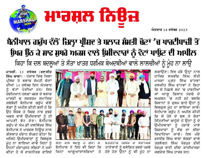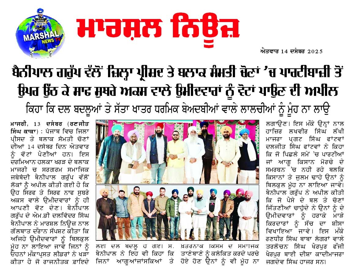 ਮਾਜਰੀ 13 ਦਸੰਬਰ( ਰਣਜੀਤ ਸਿੰਘ ਕਾਕਾ) ਪੰਜਾਬ ਵਿਚ ਜਿਲਾ ਪ੍ਰੀਸਦ ਤੇ ਬਲਾਕ ਸੰਮਤੀ ਚੋਣਾਂ ਦੀਆਂ 14 ਦਸੰਬਰ ਦਿਨ ਐਤਵਾਰ ਨੂੰ ਵੋਟਾਂ ਪੈਣੀਆਂ ਹਨ।ਇਸ ਦਰਮਿਆਨ ਹਲਕਾ ਖਰੜ ਦੇ ਬਲਾਕ ਮਾਜਰੀ ਚ ਸਰਗਰਮ ਸਮਾਜਿਕ ਜਥੇਬੰਦੀ ਬੈਨੀਪਾਲ ਗਰੁੱਪ ਵੱਲੋਂ ਲੋਕਾਂ ਨੂੰੰ ਅਪੀਲ ਕੀਤੀ ਗਈ ਹੈ ਕਿ ਉਹ ਸਿਰਫ ਤੇ ਸਿਰਫ ਸ਼ਾਫ ਸੁਥਰੇ ਅਕਸ ਵਾਲੇ ਉਮੀਦਵਾਰਾਂ ਨੂੰ ਹੀ ਆਪਣੀ ਵੋਟ ਦੇਣ1 ਬੈਨੀਪਾਲ ਗਰੁੱਪ ਦੇ ਐਮ.ਡੀ ਦਲਵਿੰਦਰ ਸਿੰਘ ਬੈਨੀਪਾਲ ਨੇ ਮਾਰਸ਼ਲ ਨਿਊਜ਼ ਨਾਲ ਗੱਲਬਾਤ ਦੌਰਾਨ ਸੱਪਸ਼ਟ ਕੀਤਾ ਕਿ ਅਜਿਹੇ ਉਮੀਦਵਾਰਾਂ ਨੂੂੰ ਬਿਲਕੁਲ ਮੂੰਹ ਨਾ ਲਾਇਆ ਜਾਵੇ ਜਿਨਾਂ ਨੂੰ ਓਹਨਾਂ ਮੌਕਾਪ੍ਰਸਤ ਲੀਡਰਾਂ ਨੇ ਖੜਾ ਕੀਤਾ ਹੈ ਜੋ ਰਾਜਨੀਤਕ ਫ਼ਾਇਦੇ ਲਈ ਦਲ ਬਦਲੂ ਹੋ ਗਏ। ਸ. ਬੈਨੀਪਾਲ ਨੇ ਇਹ ਵੀ ਕਿਹਾ ਕਿ ਜਿਨਾਂ ਆਗੂਆਂ ਜਾਂ ਸਕਿਆਂ ਤੇ ਖ਼ਤਰਨਾਕ ਕਿਸਮ ਦੇ ਸਮਾਜਿਕ ਤਾਣੇਬਾਣੇ ਨੂੰ ਕਲੰਕਿਤ ਕਰਦੇ ਪਰਚੇ ਹੋਏ ਹੋਣ ਉਨਾਂ ਨੂੰ ਵੀ ਮੂੰਹ ਨਾ ਲਗਾਉਣ1