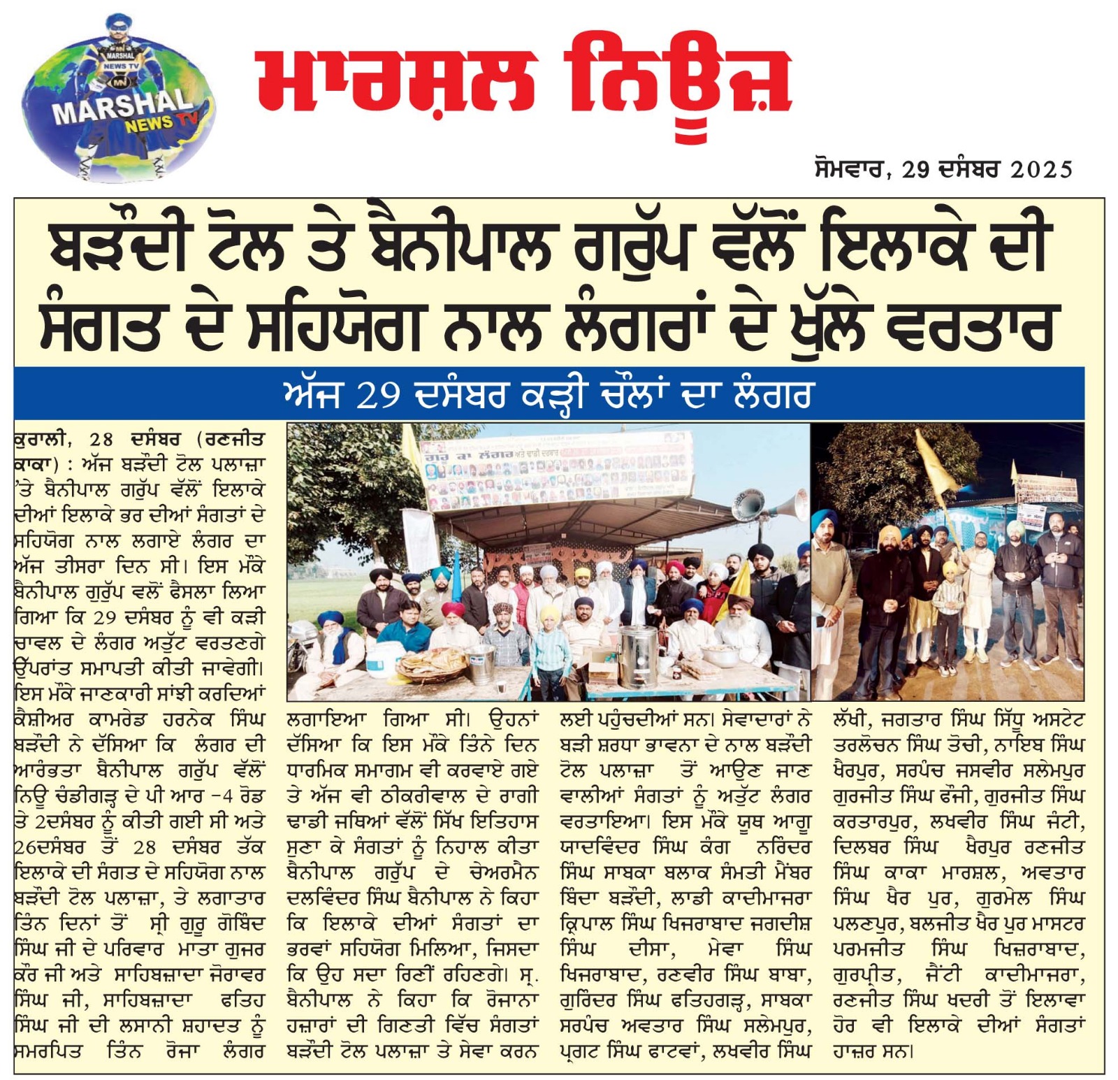 ਕੁਰਾਲੀ 28 ਦਸੰਬਰ( ਰਣਜੀਤ ਕਾਕਾ,)ਅੱਜ ਬੜੌਦੀ ਟੋਲ ਪਲਾਜ਼ਾ ‘ਤੇ ਬੈਨੀਪਾਲ ਗਰੁੱਪ ਵੱਲੋਂ ਇਲਾਕੇ ਦੀਆਂ ਇਲਾਕੇ ਭਰ ਦੀਆਂ ਸੰਗਤਾਂ ਦੇ ਸਹਿਯੋਗ ਨਾਲ ਲਗਾਏ ਲੰਗਰ ਦਾ ਅੱਜ ਤੀਸਰਾ ਦਿਨ ਸੀ ਇਸ ਮੌਕੇ ਬੈਨੀਪਾਲ ਗੁਰੁੱਪ ਵਲੋਂ ਫੈਸਲਾ ਲਿਆ ਗਿਆ ਕਿ 29 ਦਸੰਬਰ ਨੂੰ ਵੀ ਕੜੀ ਚਾਵਲ ਦੇ ਲੰਗਰ ਅਤੁੱਟ ਵਰਤਣਗੇ ਉੱਪਰਾਂਤ ਸਮਾਪਤੀ ਕੀਤੀ ਜਾਵੇਗੀ। ਇਸ ਮੌਕੇ ਜਾਣਕਾਰੀ ਸਾਂਝੀ ਕਰਦਿਆਂ ਕੈਸ਼ੀਅਰ ਕਾਮਰੇਡ ਹਰਨੇਕ ਸਿੰਘ ਬੜੌਦੀ ਨੇ ਦੱਸਿਆ ਕਿ ਲੰਗਰ ਦੀ ਆਰੰਭਤਾ ਬੈਨੀਪਾਲ ਗਰੁੱਪ ਵੱਲੋਂ ਨਿਊ ਚੰਡੀਗੜ੍ਹ ਦੇ ਪੀ ਆਰ -4 ਰੋਡ ਤੇ 2ਦਸੰਬਰ ਨੂੰ ਕੀਤੀ ਗਈ ਸੀ ਅਤੇ 26ਦਸੰਬਰ ਤੋਂ 28 ਦਸੰਬਰ ਤੱਕ ਇਲਾਕੇ ਦੀ ਸੰਗਤ ਦੇ ਸਹਿਯੋਗ ਨਾਲ ਬੜੌਦੀ ਟੋਲ ਪਲਾਜ਼ਾ, ਤੇ ਲਗਾਤਾਰ ਤਿੰਨ ਦਿਨਾਂ ਤੋਂ ਸ੍ਰੀ ਗੁਰੂ ਗੋਬਿੰਦ ਸਿੰਘ ਜੀ ਦੇ ਪਰਿਵਾਰ ਮਾਤਾ ਗੁਜਰ ਕੌਰ ਜੀ ਅਤੇ ਸਾਹਿਬਜ਼ਾਦਾ ਜੋਰਾਵਰ ਸਿੰਘ ਜੀ, ਸਾਹਿਬਜ਼ਾਦਾ ਫਤਿਹ ਸਿੰਘ ਜੀ ਦੀ ਲਸਾਨੀ ਸ਼ਹਾਦਤ ਨੂੰ ਸਮਰਪਿਤ ਤਿੰਨ ਰੋਜਾ ਲੰਗਰ ਲਗਾਇਆ ਗਿਆ ਸੀ।ਉਹਨਾਂ ਦੱਸਿਆ ਕਿ ਇਸ ਮੌਕੇ ਤਿੰਨੇ ਦਿਨ ਧਾਰਮਿਕ ਸਮਾਗਮ ਵੀ ਕਰਵਾਏ ਗਏ ਤੇ ਅੱਜ ਵੀ ਠੀਕਰੀਵਾਲ ਦੇ ਰਾਗੀ ਢਾਡੀ ਜਥਿਆਂ ਵੱਲੋਂ ਸਿੱਖ ਇਤਿਹਾਸ ਸੁਣਾ ਕੇ ਸੰਗਤਾਂ ਨੂੰ ਨਿਹਾਲ ਕੀਤਾ ਬੈਨੀਪਾਲ ਗਰੁੱਪ ਦੇ ਚੇਅਰਮੈਨ ਦਲਵਿੰਦਰ ਸਿੰਘ ਬੈਨੀਪਾਲ ਨੇ ਕਿਹਾ ਕਿ ਇਲਾਕੇ ਦੀਆਂ ਸੰਗਤਾਂ ਦਾ ਭਰਵਾਂ ਸਹਿਯੋਗ ਮਿਲਿਆ, ਜਿਸਦਾ ਕਿ ਉਹ ਸਦਾ ਰਿਣੀਂ ਰਹਿਣਗੇ। ਸ੍ਰ.ਬੈਨੀਪਾਲ ਨੇ ਕਿਹਾ ਕਿ ਰੋਜਾਨਾ ਹਜ਼ਾਰਾਂ ਦੀ ਗਿਣਤੀ ਵਿੱਚ ਸੰਗਤਾਂ ਬੜੌਦੀ ਟੋਲ ਪਲਾਜ਼ਾ ਤੇ ਸੇਵਾ ਕਰਨ ਲਈ ਪਹੁੰਚਦੀਆਂ ਸਨ। ਸੇਵਾਦਾਰਾਂ ਨੇ ਬੜੀ ਸ਼ਰਧਾ ਭਾਵਨਾ ਦੇ ਨਾਲ ਬੜੌਦੀ ਟੋਲ ਪਲਾਜ਼ਾ ਤੋਂ ਆਉਣ ਜਾਣ ਵਾਲੀਆਂ ਸੰਗਤਾਂ ਨੂੰ ਅਤੁੱਟ ਲੰਗਰ ਵਰਤਾਇਆ। ਇਸ ਮੌਕੇ ਯੂਥ ਆਗੂ ਯਾਦਵਿੰਦਰ ਸਿੰਘ ਕੰਗ ਨਰਿੰਦਰ ਸਿੰਘ ਸਾਬਕਾ ਬਲਾਕ ਸੰਮਤੀ ਮੈਂਬਰ ਬਿੰਦਾ ਬੜੌਦੀ, ਲਾਡੀ ਕਾਦੀਮਾਜਰਾ ਕ੍ਰਿਪਾਲ ਸਿੰਘ ਖਿਜਰਾਬਾਦ ਜਗਦੀਸ਼ ਸਿੰਘ ਦੀਸਾ, ਮੇਵਾ ਸਿੰਘ ਖਿਜਰਾਬਾਦ, ਰਣਵੀਰ ਸਿੰਘ ਬਾਬਾ, ਗੁਰਿੰਦਰ ਸਿੰਘ ਫਤਿਹਗੜ੍ਹ, ਸਾਬਕਾ ਸਰਪੰਚ ਅਵਤਾਰ ਸਿੰਘ ਸਲੇਮਪੁਰ, ਪ੍ਰਗਟ ਸਿੰਘ ਫਾਟਵਾਂ, ਲਖਵੀਰ ਸਿੰਘ ਲੱਖੀ, ਜਗਤਾਰ ਸਿੰਘ ਸਿੱਧੂ ਅਸਟੇਟ ਤਰਲੋਚਨ ਸਿੰਘ ਤੋਚੀ, ਨਾਇਬ ਸਿੰਘ ਖੈਰਪੁਰ, ਸਰਪੰਚ ਜਸਵੀਰ ਸਲੇਮਪੁਰ ਗੁਰਜੀਤ ਸਿੰਘ ਫੌਜੀ, ਗੁਰਜੀਤ ਸਿੰਘ ਕਰਤਾਰਪੁਰ, ਲਖਵੀਰ ਸਿੰਘ ਜੰਟੀ, ਦਿਲਬਰ ਸਿੰਘ ਖੈਰਪੁਰ ਰਣਜੀਤ ਸਿੰਘ ਕਾਕਾ ਮਾਰਸ਼ਲ, ਅਵਤਾਰ ਸਿੰਘ ਖੈਰ ਪੁਰ, ਗੁਰਮੇਲ ਸਿੰਘ ਪਲਣਪੁਰ, ਬਲਜੀਤ ਖੈਰ ਪੁਰ ਮਾਸਟਰ ਪਰਮਜੀਤ ਸਿੰਘ ਖਿਜ਼ਰਾਬਾਦ, ਗੁਰਪ੍ਰੀਤ ,ਜੈਂਟੀ ਕਾਦੀਮਾਜਰਾ ,ਰਣਜੀਤ ਸਿੰਘ ਖਦਰੀ ਤੋਂ ਇਲਾਵਾ ਹੋਰ ਵੀ ਇਲਾਕੇ ਦੀਆਂ ਸੰਗਤਾਂ ਹਾਜ਼ਰ ਸਨ।