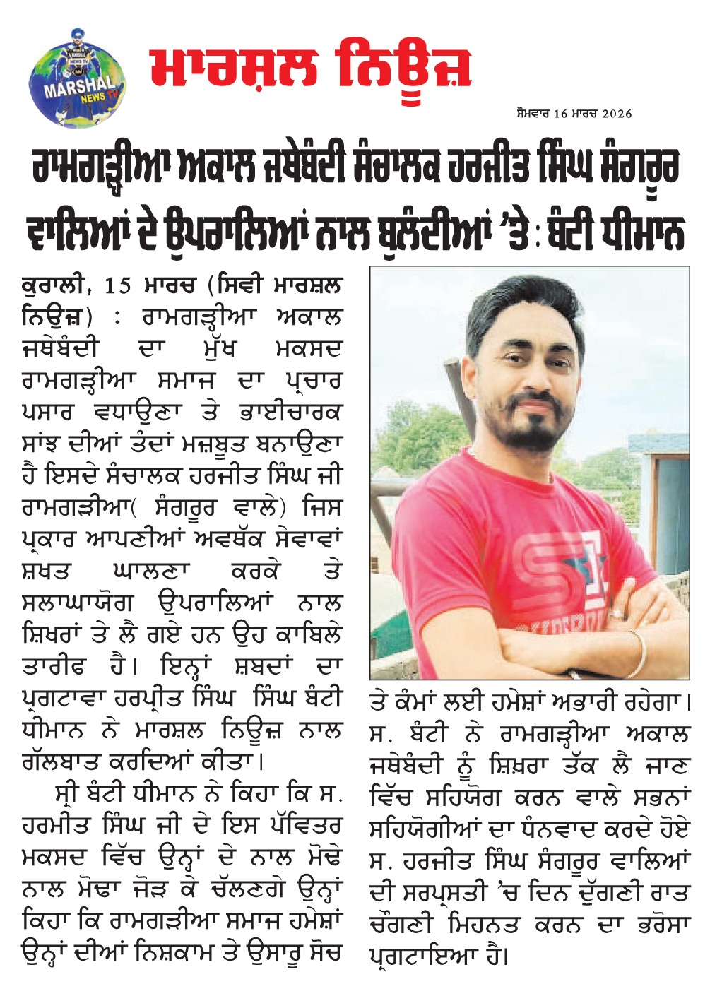 ਕੁਰਾਲੀ 15 ਮਾਰਚ( ਸਿਵੀ ਮਾਰਸ਼ਲ ਨਿਉਜ਼) ਰਾਮਗੜ੍ਹੀਆ ਅਕਾਲ ਜਥੇਬੰਦੀ ਦਾ ਮੁੱਖ ਮਕਸਦ ਰਾਮਗੜ੍ਹੀਆ ਸਮਾਜ ਦਾ ਪ੍ਰਚਾਰ ਪਸਾਰ ਵਧਾਉਣਾ ਤੇ ਭਾਈਚਾਰਕ ਸਾਂਝ ਦੀਆਂ ਤੰਦਾ ਮਜਬੂਤ ਬਨਾਉਣਾ ਹੈ ਇਸਦੇ ਸੰਚਾਲਕ ਹਰਜੀਤ ਸਿੰਘ ਜੀ ਰਾਮਗੜੀਆ( ਸੰਗਰੂਰ ਵਾਲੇ) ਜਿਸ ਪ੍ਰਕਾਰ ਆਪਣੀਆਂ ਅਵਥੱਕ ਸੇਵਾਵਾਂ ਸ਼ਖਤ ਘਾਲਣਾ ਕਰਕੇ ਤੇ ਸਲਾਘਾਯੋਗ ਉਪਰਾਲਿਆਂ ਨਾਲ ਸ਼ਿਖਰਾਂ ਤੇ ਲੈ ਗਏ ਹਨ ਉਹ ਕਾਬਿਲੇ ਤਾਰੀਫ ਹੈ1 ਇਨਾਂ ਸ਼ਬਦਾ ਦਾ ਪ੍ਗਟਾਵਾ ਹਰਪ੍ਰੀਤ ਸਿੰਘ ਸਿੰਘ ਬੰਟੀ ਧੀਮਾਨ ਨੇ ਮਾਰਸ਼ਲ ਨਿਊਜ਼ ਨਾਲ ਗੱਲਬਾਤ ਕਰਦਿਆਂ ਕੀਤਾ1 ਸ੍ਰੀ ਬੰਟੀ ਧੀਮਾਨ ਨੇ ਕਿਹਾ ਕਿ ਸ. ਹਰਜੀਤ ਸਿੰਘ ਜੀ ਦੇ ਇਸ ਪੱਵਿਤਰ ਮਕਸਦ ਵਿੱਚ ਉਨ੍ਹਾਂਦੇ ਨਾਲ ਮੋਢੇ ਨਾਲ ਮੋਢਾ ਜੋੜ ਕੇ ਚੱਲਣਗੇ ਉਨ੍ਹਾਂ ਕਿਹਾ ਕਿ ਰਾਮਗੜੀਆ ਸਮਾਜ ਹਮੇਸ਼ਾਂ ਉਨ੍ਹਾਂ ਦੀਆਂ ਨਿਸ਼ਕਾਮ ਤੇ ਉਸਾਰੂ ਸੋਚ ਤੇ ਕੰਮਾਂ ਲਈ ਹਮੇਸ਼ਾਂ ਅਭਾਰੀ ਰਹੇਗਾ1 ਸ. ਬੰਟੀ ਨੇ ਰਾਮਗੜ੍ਹੀਆ ਅਕਾਲ ਜਥੇਬੰਦੀ ਨੂੰ ਸ਼ਿਖ਼ਰਾ ਤੱਕ ਲੈ ਜਾਣ ਵਿੱਚ ਸਹਿਯੋਗ ਕਰਨ ਵਾਲੇ ਸਭਨਾਂ ਸਹਿਯੋਗੀਆਂ ਦਾ ਧੰਨਵਾਦ ਕਰਦੇ ਹੋਏ ਸ. ਹਰਜੀਤ ਸਿੰਘ ਸੰਗਰੂਰ ਵਾਲਿਆਂ ਦੀ ਸਰਪ੍ਰਸਤੀ ‘ਚ ਦਿਨ ਦੁੱਗਣੀ ਰਾਤ ਚੌਗਣੀ ਮਿਹਨਤ ਕਰਨ ਦਾ ਭਰੋਸਾ ਪ੍ਰਗਟਾਇਆ ਹੈ।