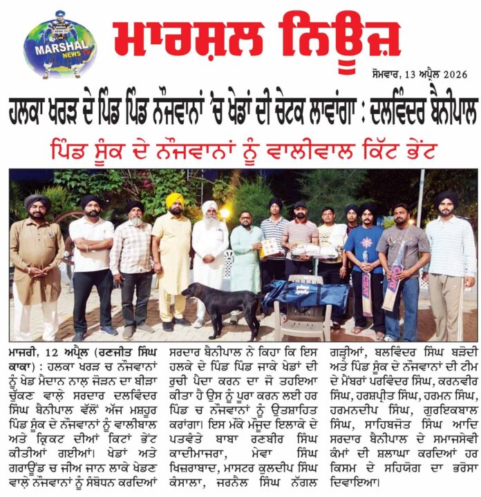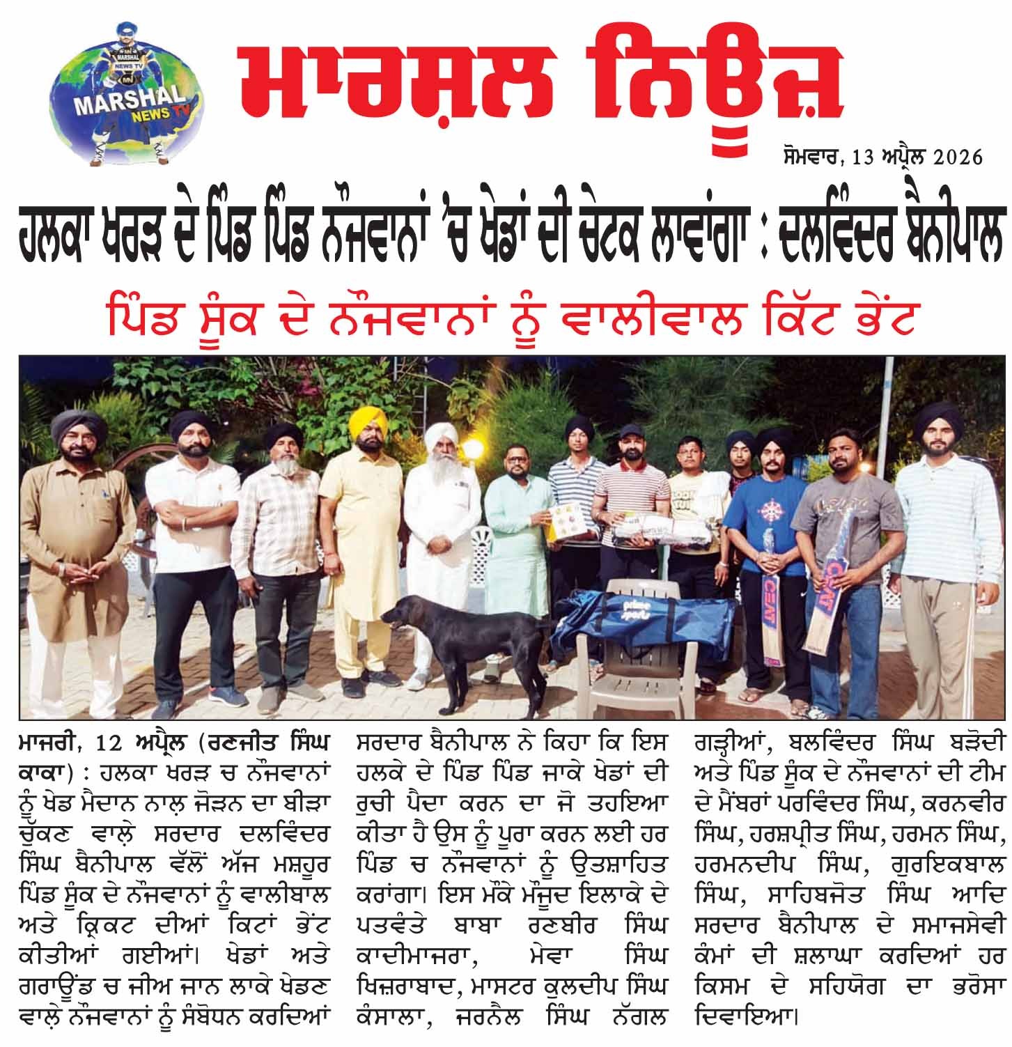 ਪਿੰਡ ਸੂੰਕ ਦੇ ਨੌਜਵਾਨਾਂ ਨੂੰ ਵਾਲੀਵਾਲ ਕਿੱਟ ਭੇਂਟ ਮਾਜਰੀ 12 ਅਪ੍ਰੈਲ ( ਰਣਜੀਤ ਸਿੰਘ ਕਾਕਾ)ਹਲਕਾ ਖਰੜ ਚ ਨੌਜਵਾਨਾਂ ਨੂੰ ਖੇਡ ਮੈਦਾਨ ਨਾਲ਼ ਜੋੜਨ ਦਾ ਬੀੜਾ ਚੁੱਕਣ ਵਾਲ਼ੇ ਸਰਦਾਰ ਦਲਵਿੰਦਰ ਸਿੰਘ ਬੈਨੀਪਾਲ ਵੱਲੋਂ ਅੱਜ ਮਸ਼ਹੂਰ ਪਿੰਡ ਸੂੰਕ ਦੇ ਨੌਜਵਾਨਾਂ ਨੂੰ ਵਾਲੀਬਾਲ ਅਤੇ ਕ੍ਰਿਕਟ ਦੀਆਂ ਕਿਟਾਂ ਭੇਂਟ ਕੀਤੀਆਂ ਗਈਆਂ । ਖੇਡਾਂ ਅਤੇ ਗਰਾਊਂਡ ਚ ਜੀਅ ਜਾਨ ਲਾਕੇ ਖੇਡਣ ਵਾਲ਼ੇ ਨੌਜਵਾਨਾਂ ਨੂੰ ਸੰਬੋਧਨ ਕਰਦਿਆਂ ਸਰਦਾਰ ਬੈਨੀਪਾਲ ਨੇ ਕਿਹਾ ਕਿ ਇਸ ਹਲਕੇ ਦੇ ਪਿੰਡ ਪਿੰਡ ਜਾਕੇ ਖੇਡਾਂ ਦੀ ਰੁਚੀ ਪੈਦਾ ਕਰਨ ਦਾ ਜੋ ਤਹਇਆ ਕੀਤਾ ਹੈ ਉਸ ਨੂੰ ਪੂਰਾ ਕਰਨ ਲਈ ਹਰ ਪਿੰਡ ਚ ਨੌਜਵਾਨਾਂ ਨੂੰ ਉਤਸ਼ਾਹਿਤ ਕਰਾਂਗਾ।
