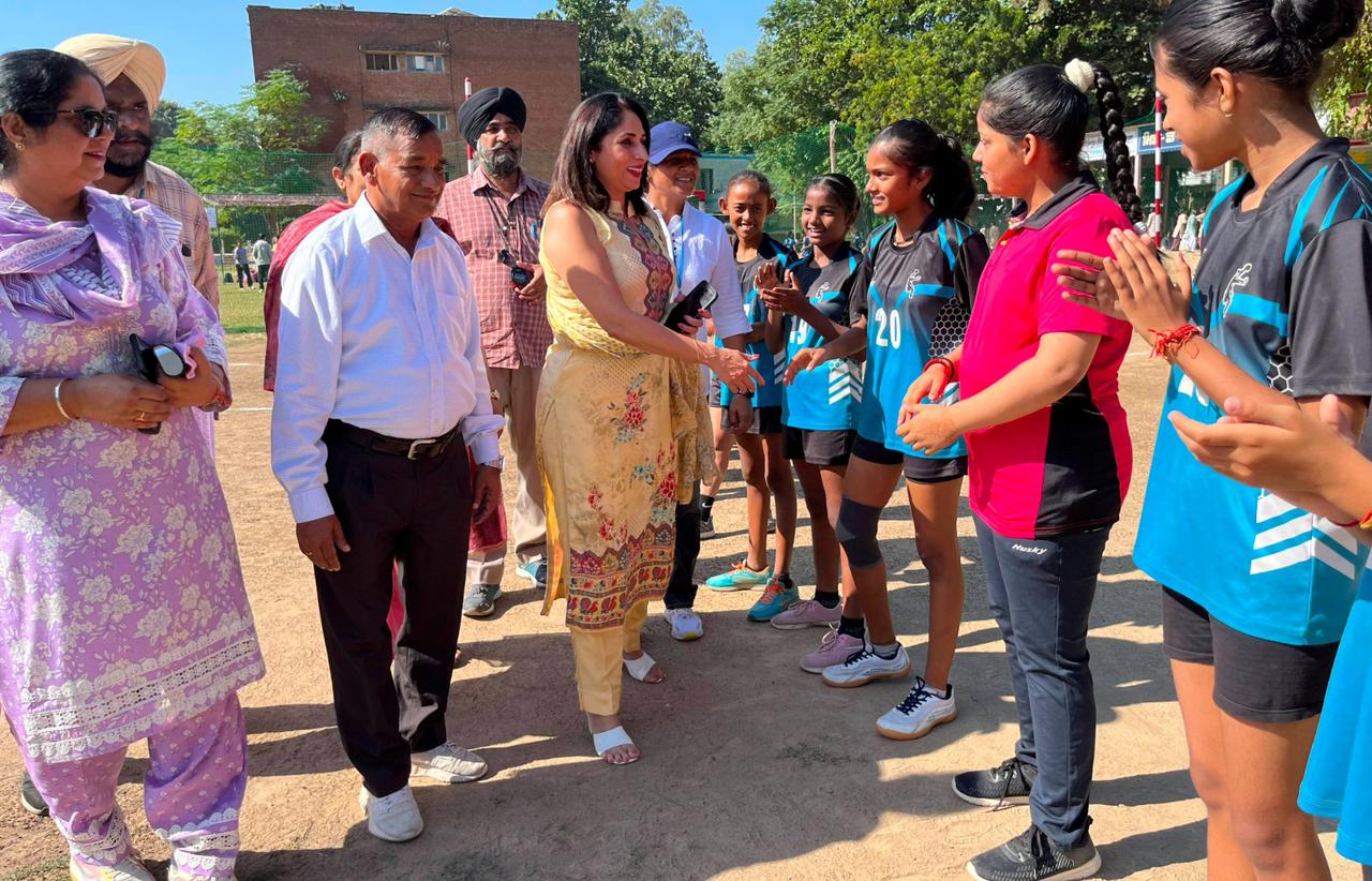ਫੋਟੋ: ਹੈਂਡਬਾਲ ਦਾ ਉਦਘਾਟਨੀ ਮੈਚ ਖੇਡਣ ਵਾਲੀਆਂ ਟੀਮਾਂ ਨਾਲ ਜਾਣ ਪਹਚਾਣ ਕਰਦੇ ਡਾ: ਇੰਦੂ ਬਾਲਾ ਤੇ ਹੋਰ ਪ੍ਰਬੰਧਕ।