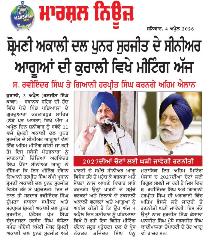ਕੁਰਾਲੀ, 3 ਅਪ੍ਰੈਲ ( ਰਣਜੀਤ ਸਿੰਘ ਕਾਕਾ)- ਸਥਾਨਕ ਸ਼ਹਿਰ ਦੀ ਹੱਦ ਵਿੱਚ ਪੈਂਦੇ ਪਿੰਡ ਪਡਿਆਲਾ ਦੇ ਗੁਰਦੁਆਰਾ ਕਰਤਾਰਪੁਰ ਸਾਹਿਬ (ਨੇੜੇ ਪ੍ਰਭ ਆਸਰਾ) ਵਿਖੇ ਅੱਜ 4 ਅਪ੍ਰੈਲ ਦਿਨ ਸ਼ਨੀਵਾਰ ਨੂੰ ਸਵੇਰੇ 11 ਵਜੇ ਸ਼੍ਰੋਮਣੀ ਅਕਾਲੀ ਦਲ ਪੁਨਰ ਸੁਰਜੀਤ ਦੇ ਸੀਨੀਅਰ ਆਗੂਆਂ ਵੱਲੋਂ ਇੱਕ ਅਹਿਮ ਮੀਟਿੰਗ ਕੀਤੀ ਜਾ ਰਹੀ ਹੈ। ਇਸ ਸਬੰਧੀ ਪੱਤਰਕਾਰਾਂ ਨੂੰ ਜਾਣਕਾਰੀ ਦਿੰਦਿਆਂ ਅਰਵਿੰਦਰ ਸਿੰਘ ਪੈਂਟਾ ਸੀਨੀਅਰ ਆਗੂ ਨੇ ਦੱਸਿਆ ਕਿ ਇਸ ਮੀਟਿੰਗ ਦੌਰਾਨ ਗਿਆਨੀ ਹਰਪ੍ਰੀਤ ਸਿੰਘ ਕੌਮੀ ਪ੍ਰਧਾਨ ਸ਼੍ਰੋਮਣੀ ਅਕਾਲੀ ਦਲ ਪੁਨਰ ਸੁਰਜੀਤ ਵਿਸ਼ੇਸ਼ ਤੌਰ ਤੇ ਪਹੁੰਚਣਗੇ। ਇਸ ਦੇ ਨਾਲ ਹੀ ਸਰਦਾਰ ਰਵੀਇੰਦਰ ਸਿੰਘ ਦੁੱਮਣਾ ਸਾਬਕਾ ਸਪੀਕਰ ਅਤੇ ਸਰਪ੍ਰਸਤ ਸ਼੍ਰੋਮਣੀ ਅਕਾਲੀ ਦਲ ਪੁਨਰ ਸੁਰਜੀਤ, ਪ੍ਰੋਫੈਸਰ ਪ੍ਰੇਮ ਸਿੰਘ ਚੰਦੂਮਾਜਰਾ ਹਰਬੰਸ ਸਿੰਘ ਕੰਧੋਲਾ ਸਮੇਤ ਪੀਏਸੀ ਕਮੇਟੀ ਮੈਂਬਰ ਸ਼੍ਰੋਮਣੀ ਅਕਾਲੀ ਦਲ ਪੁਨਰ ਸੁਰਜੀਤ ਅਤੇ ਪਾਰਟੀ ਦੇ ਸਮੁੱਚੇ ਸੀਨੀਅਰ ਆਗੂ ਵਿਸ਼ੇਸ਼ ਤੌਰ ਤੇ ਪਹੁੰਚ ਕੇ ਵਰਕਰਾਂ ਅਤੇ ਮੈਂਬਰਾਂ ਨਾਲ ਆਪਣੇ ਵਿਚਾਰ ਸਾਂਝੇ ਕਰਨਗੇ। ਉਨ੍ਹਾਂ ਪਾਰਟੀ ਦੇ ਸਮੁੱਚੇ ਵਰਕਰਾਂ ਅਤੇ ਇਲਾਕੇ ਦੇ ਟਕਸਾਲੀ ਅਕਾਲੀ ਵਰਕਰਾਂ ਅਤੇ ਆਗੂਆਂ ਨੂੰ ਅਪੀਲ ਕੀਤੀ ਹੈ ਕਿ ਉਹ ਅੱਜ 4 ਅਪ੍ਰੈਲ ਦਿਨ ਸ਼ਨੀਵਾਰ ਨੂੰ ਪਡਿਆਲਾ ਵਿਖੇ ਹੋ ਰਹੀ ਇਸ ਵਿਸ਼ੇਸ਼ ਮੀਟਿੰਗ ਦੌਰਾਨ ਜਰੂਰ ਪਹੁੰਚਣ। ਦਲ ਦੇ ਪ੍ਰੈਸ ਨੱਕਤਰ ਤਜਿੰਦਰ ਸਿੰਘ ਪੰਨੂ ਮੁਤਾਬਿਕ ਇਹ ਅਹਿਮ ਮਿਟਿੰਗ ਪੰਜਾਬ ਚ 2027ਦੀਆਂ ਚੋਟਾਂ ਲਈ ਬਿਗੁਲ ਸਮਝੀ ਜਾ ਰਹੀ ਹੈ ਜਿਸ ਵਿਚ ਸ਼੍ਰ ਰਵੀਇੰਦਰ ਸਿੰਘ ਅਤੇ ਗਿਆਨੀ ਹਰਪ੍ਰੀਤ ਸਿੰਘ ਦੀ ਅਗਵਾਈ ਵਿੱਚ ਅਹਿਮ ਫੈਸਲੇ ਲਏ ਜਾਣਗੇ ਤੇ ਰਣਨੀਤੀ ਘੜੀ ਜਾਵੇਗੀ1 ਇਸ ਮੌਕੇ ਉਨ੍ਹਾਂ ਨਾਲ ਸੁਰਜੀਤ ਸਿੰਘ ਕੰਸਾਲਾ ਪਨਜੀਤ ਸਿੰਘ ਮੂੰਧੋ ਸਰਬਜੀਤ ਸਿੰਘ ਕਾਦੀਮਾਜਰਾ ਤੇਪਾਰਟੀ ਦੇ ਹੋਰ ਆਗੂ ਵੀ ਹਾਜ਼ਰ ਸਨ।