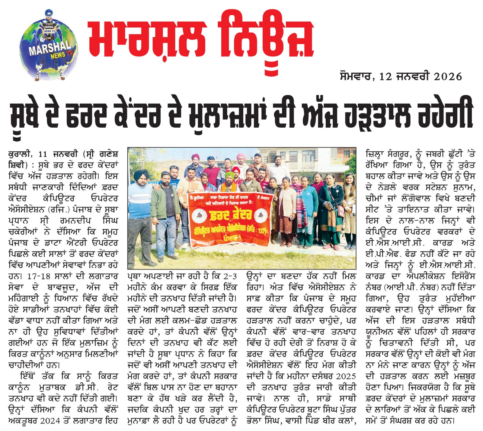 ਕੁਰਾਲੀ11 ਜਨਵਰੀ (ਸ੍ਰੀ ਗਣੇਸ਼ ਸ਼ਿਵੀ)- ਸੂਬੇ ਭਰ ਦੇ ਫਰਦ ਕੇਂਦਰਾਂ ਵਿੱਚ ਅੱਜ ਹੜਤਾਲ ਰਹੇਗੀ। ਇਸ ਸਬੰਧੀ ਜਾਣਕਾਰੀ ਦਿੰਦਿਆਂ ਫ਼ਰਦ ਕੇਂਦਰ ਕੰਪਿਊਟਰ ਓਪਰੇਟਰ ਐਸੋਸੀਏਸ਼ਨ (ਰਜਿ.) ਪੰਜਾਬ ਦੇ ਸੂਬਾ ਪ੍ਰਧਾਨ ਸ੍ਰੀ ਰਮਨਦੀਪ ਸਿੰਘ ਚਕੇਰੀਆਂ ਨੇ ਦੱਸਿਆ ਕਿ ਸਮੂਹ ਪੰਜਾਬ ਦੇ ਡਾਟਾ ਐਂਟਰੀ ਓਪਰੇਟਰ ਪਿਛਲੇ ਕਈ ਸਾਲਾਂ ਤੋਂ ਫਰਦ ਕੇਂਦਰਾਂ ਵਿੱਚ ਆਪਣੀਆਂ ਸੇਵਾਵਾਂ ਨਿਭਾ ਰਹੇ ਹਨ। 17–18 ਸਾਲਾਂ ਦੀ ਲਗਾਤਾਰ ਸੇਵਾ ਦੇ ਬਾਵਜੂਦ, ਅੱਜ ਦੀ ਮਹਿੰਗਾਈ ਨੂੰ ਧਿਆਨ ਵਿੱਚ ਰੱਖਦੇ ਹੋਏ ਸਾਡੀਆਂ ਤਨਖਾਹਾਂ ਵਿੱਚ ਕੋਈ ਵੱਡਾ ਵਾਧਾ ਨਹੀਂ ਕੀਤਾ ਗਿਆ ਅਤੇ ਨਾ ਹੀ ਉਹ ਸੁਵਿਧਾਵਾਂ ਦਿੱਤੀਆਂ ਗਈਆਂ ਹਨ ਜੋ ਇੱਕ ਮੁਲਾਜ਼ਿਮ ਨੂੰ ਕਿਰਤ ਕਾਨੂੰਨਾਂ ਅਨੁਸਾਰ ਮਿਲਣੀਆਂ ਚਾਹੀਦੀਆਂ ਹਨ। ਇੱਥੋਂ ਤੱਕ ਕਿ ਸਾਨੂੰ ਕਿਰਤ ਕਾਨੂੰਨ ਮੁਤਾਬਕ ਡੀ.ਸੀ. ਰੇਟ ਤਨਖਾਹ ਵੀ ਕਦੇ ਨਹੀਂ ਦਿੱਤੀ ਗਈ। ਉਨ੍ਹਾਂ ਦੱਸਿਆ ਕਿ ਕੰਪਨੀ ਵੱਲੋਂ ਅਕਤੂਬਰ 2024 ਤੋਂ ਲਗਾਤਾਰ ਇਹ ਪ੍ਰਥਾ ਅਪਣਾਈ ਜਾ ਰਹੀ ਹੈ ਕਿ 2–3 ਮਹੀਨੇ ਕੰਮ ਕਰਵਾ ਕੇ ਸਿਰਫ਼ ਇੱਕ ਮਹੀਨੇ ਦੀ ਤਨਖਾਹ ਦਿੱਤੀ ਜਾਂਦੀ ਹੈ। ਜਦੋਂ ਅਸੀਂ ਆਪਣੀ ਬਣਦੀ ਤਨਖਾਹ ਦੀ ਮੰਗ ਲਈ ਕਲਮ-ਛੋਡ ਹੜਤਾਲ ਕਰਦੇ ਹਾਂ, ਤਾਂ ਕੰਪਨੀ ਵੱਲੋਂ ਉਨ੍ਹਾਂ ਦਿਨਾਂ ਦੀ ਤਨਖਾਹ ਵੀ ਕੱਟ ਲਈ ਜਾਂਦੀ ਹੈ ਸੂਬਾ ਪ੍ਰਧਾਨ ਨੇ ਕਿਹਾ ਕਿ ਜਦੋਂ ਵੀ ਅਸੀਂ ਆਪਣੀ ਤਨਖਾਹ ਦੀ ਮੰਗ ਕਰਦੇ ਹਾਂ, ਤਾਂ ਕੰਪਨੀ ਸਰਕਾਰ ਵੱਲੋਂ ਬਿਲ ਪਾਸ ਨਾ ਹੋਣ ਦਾ ਬਹਾਨਾ ਬਣਾ ਕੇ ਹੱਥ ਖੜੇ ਕਰ ਲੈਂਦੀ ਹੈ, ਜਦਕਿ ਕੰਪਨੀ ਖੁਦ ਹਰ ਤਰ੍ਹਾਂ ਦਾ ਮੁਨਾਫ਼ਾ ਲੈ ਰਹੀ ਹੈ ਪਰ ਓਪਰੇਟਰਾਂ ਨੂੰ ਉਨ੍ਹਾਂ ਦਾ ਬਣਦਾ ਹੱਕ ਨਹੀਂ ਮਿਲ ਰਿਹਾ। ਅੰਤ ਵਿੱਚ ਐਸੋਸੀਏਸ਼ਨ ਨੇ ਸਾਫ਼ ਕੀਤਾ ਕਿ ਪੰਜਾਬ ਦੇ ਸਮੂਹ ਫਰਦ ਕੇਂਦਰ ਕੰਪਿਊਟਰ ਓਪਰੇਟਰ ਹੜਤਾਲ ਨਹੀਂ ਕਰਨਾ ਚਾਹੁੰਦੇ, ਪਰ ਕੰਪਨੀ ਵੱਲੋਂ ਵਾਰ-ਵਾਰ ਤਨਖਾਹ ਵਿੱਚ ਹੋ ਰਹੀ ਦੇਰੀ ਤੋਂ ਨਿਰਾਸ਼ ਹੋ ਕੇ ਫ਼ਰਦ ਕੇਂਦਰ ਕੰਪਿਊਟਰ ਓਪਰੇਟਰ ਐਸੋਸੀਏਸ਼ਨ ਵੱਲੋਂ ਇਹ ਮੰਗ ਕੀਤੀ ਜਾਂਦੀ ਹੈ ਕਿ ਮਹੀਨਾ ਦਸੰਬਰ 2025 ਦੀ ਤਨਖਾਹ ਤੁਰੰਤ ਜਾਰੀ ਕੀਤੀ ਜਾਵੇ। ਨਾਲ ਹੀ, ਸਾਡੇ ਸਾਥੀ ਕੰਪਿਊਟਰ ਓਪਰੇਟਰ ਬੂਟਾ ਸਿੰਘ ਪੁੱਤਰ ਭੋਲਾ ਸਿੰਘ, ਵਾਸੀ ਪਿੰਡ ਬੀਰ ਕਲਾਂ, ਜ਼ਿਲ੍ਹਾ ਸੰਗਰੂਰ, ਨੂੰ ਜਬਰੀ ਛੁੱਟੀ ’ਤੇ ਰੱਖਿਆ ਗਿਆ ਹੈ, ਉਸ ਨੂੰ ਤੁਰੰਤ ਬਹਾਲ ਕੀਤਾ ਜਾਵੇ ਅਤੇ ਉਸ ਨੂੰ ਉਸ ਦੇ ਨੇੜਲੇ ਵਰਕ ਸਟੇਸ਼ਨ ਸੁਨਾਮ, ਚੀਮਾਂ ਜਾਂ ਲੋਂਗੋਵਾਲ ਵਿਖੇ ਬਣਦੀ ਸੀਟ ’ਤੇ ਤਾਇਨਾਤ ਕੀਤਾ ਜਾਵੇ। ਇਸ ਦੇ ਨਾਲ-ਨਾਲ ਜਿਨ੍ਹਾਂ ਵੀ ਕੰਪਿਊਟਰ ਓਪਰੇਟਰ ਵਰਕਰਾਂ ਦੇ ਈ.ਐਸ.ਆਈ.ਸੀ. ਕਾਰਡ ਅਤੇ ਈ.ਪੀ.ਐਫ. ਫੰਡ ਨਹੀਂ ਕੱਟੇ ਜਾ ਰਹੇ ਅਤੇ ਜਿਨ੍ਹਾਂ ਨੂੰ ਈ.ਐਸ.ਆਈ.ਸੀ. ਕਾਰਡ ਦਾ ਐਪਲੀਕੇਸ਼ਨ ਇਸੋਰੈਂਸ ਨੰਬਰ (ਆਈ.ਪੀ. ਨੰਬਰ) ਨਹੀਂ ਦਿੱਤਾ ਗਿਆ, ਉਹ ਤੁਰੰਤ ਮੁਹੱਈਆ ਕਰਵਾਏ ਜਾਣ। ਉਨ੍ਹਾਂ ਦੱਸਿਆ ਕਿ ਅੱਜ ਦੀ ਇਸ ਹੜਤਾਲ ਸਬੰਧੀ ਯੂਨੀਅਨ ਵੱਲੋਂ ਪਹਿਲਾਂ ਹੀ ਸਰਕਾਰ ਨੂੰ ਚਿਤਾਵਨੀ ਦਿੱਤੀ ਸੀ, ਪਰ ਸਰਕਾਰ ਵੱਲੋਂ ਉਨ੍ਹਾਂ ਦੀ ਕੋਈ ਵੀ ਮੰਗ ਨਾ ਮੰਨੇ ਜਾਣ ਕਾਰਨ ਉਨ੍ਹਾਂ ਨੂੰ ਅੱਜ ਦੀ ਹੜਤਾਲ ਕਰਨ ਲਈ ਮਜ਼ਬੂਰ ਹੋਣਾ ਪਿਆ। ਜਿਕਰਯੋਗ ਹੈ ਕਿ ਸੂਬੇ ਫ਼ਰਦ ਕੇਂਦਰਾਂ ਦੇ ਮੁਲਾਜ਼ਮਾਂ ਸਰਕਾਰ ਦੇ ਲਾਰਿਆਂ ਤੋਂ ਅੱਕ ਕੇ ਪਿਛਲੇ ਕਈ ਸਮੇਂ ਤੋਂ ਸੰਘਰਸ਼ ਕਰ ਰਹੇ ਹਨ।