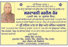ਕੁਰਾਲੀ 13 ਸਤੰਬਰ (ਰਣਜੀਤ ਕਾਕਾ)ਸਮਾਜ ਸੇਵੀ ਸਖਸ਼ੀਅਤ ਮਾਤਾ ਜਰਨੈਲ ਕੌਰ ਜੋ ਪਿਛਲੇ ਦਿਨੀਂ ਅਕਾਲ ਚਲਾਣਾ ਕਰ ਗਏ ਸਨ, ਨਮਿਤ ਸ੍ਰੀ ਸਹਿਜ ਪਾਠ ਦਾ ਭੋਗ...